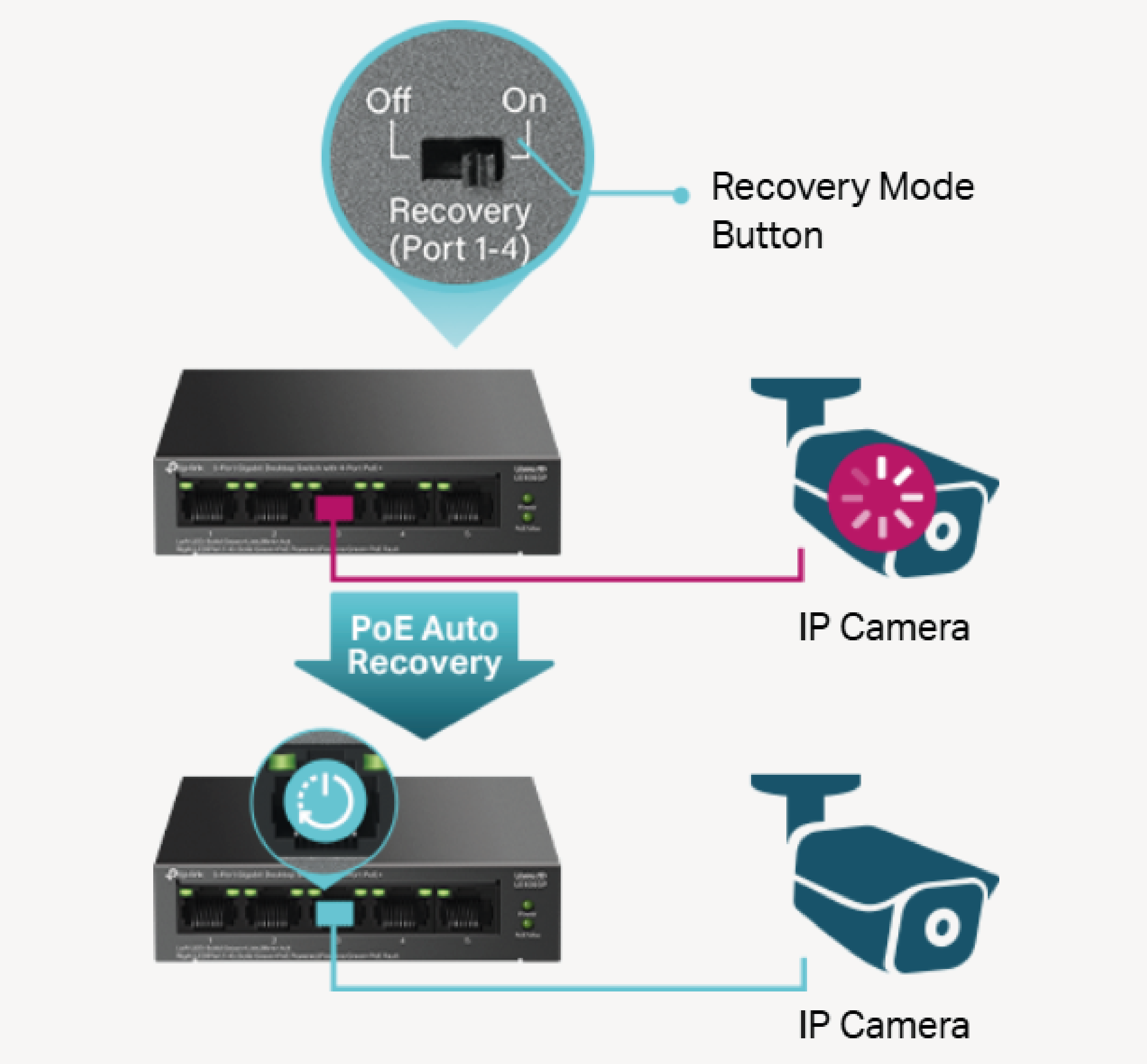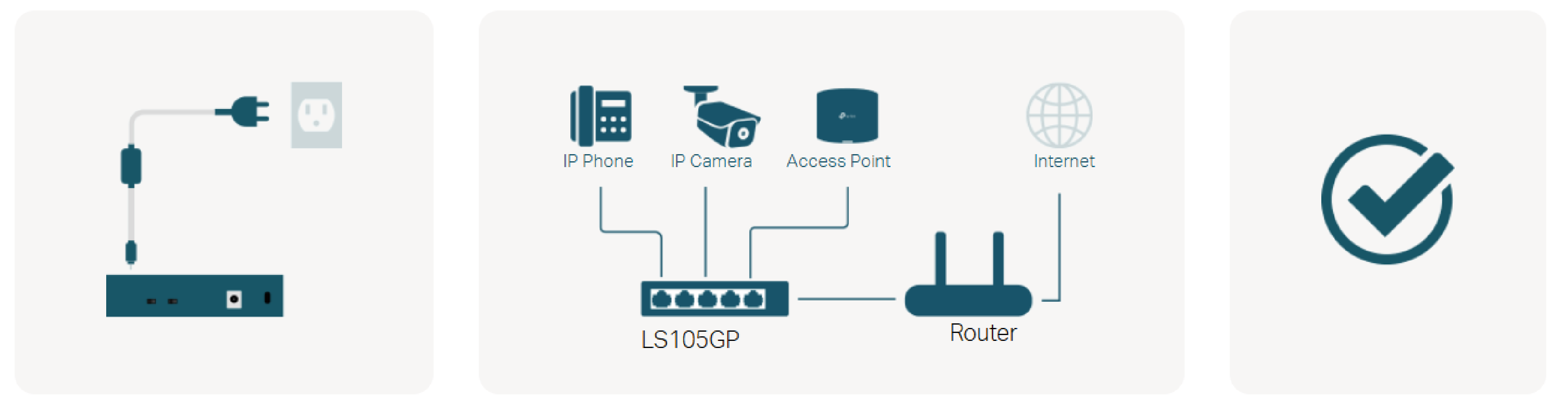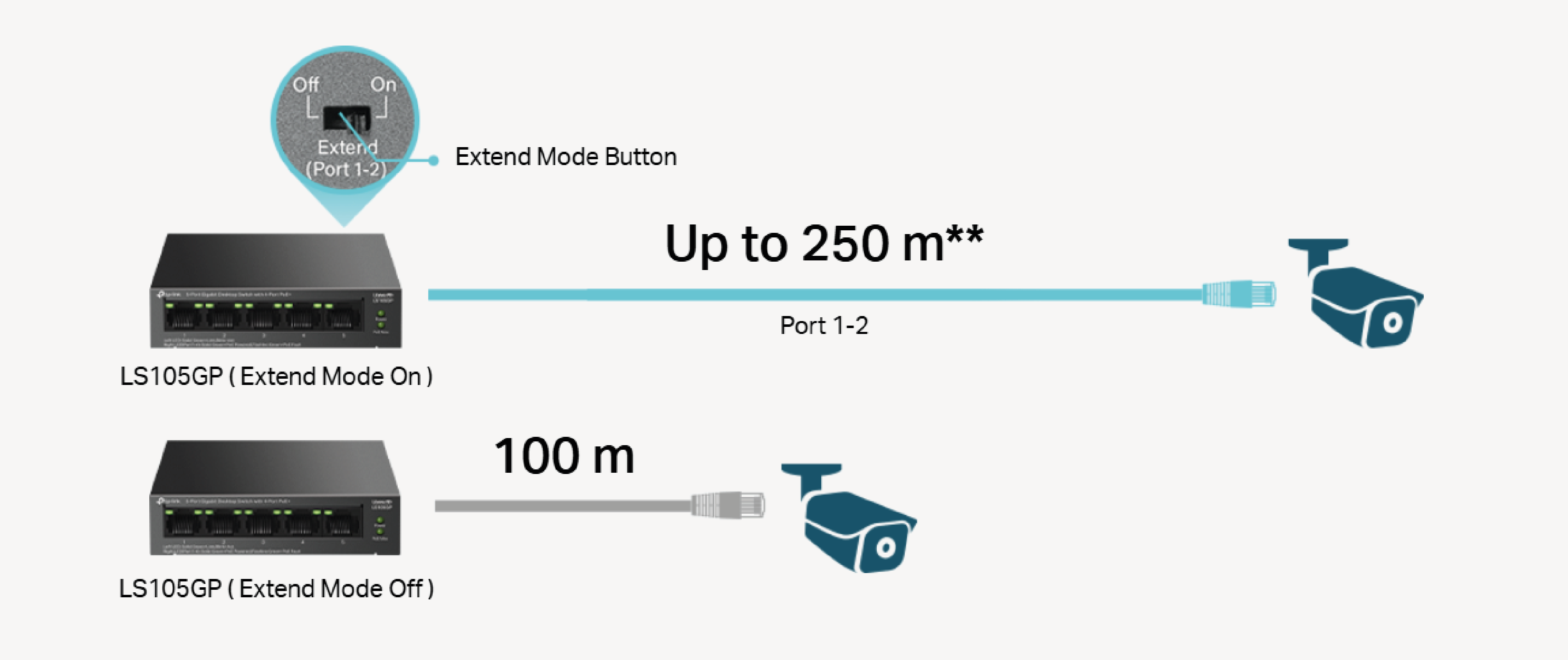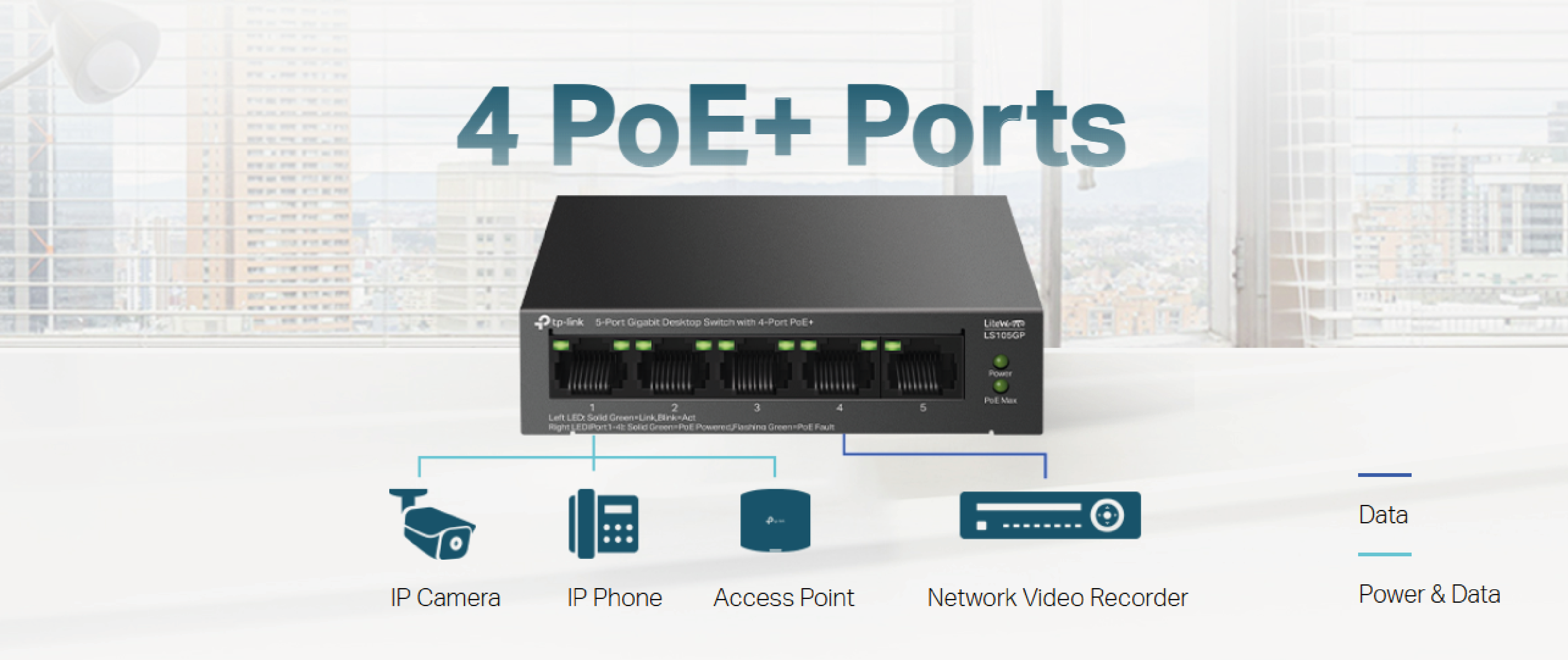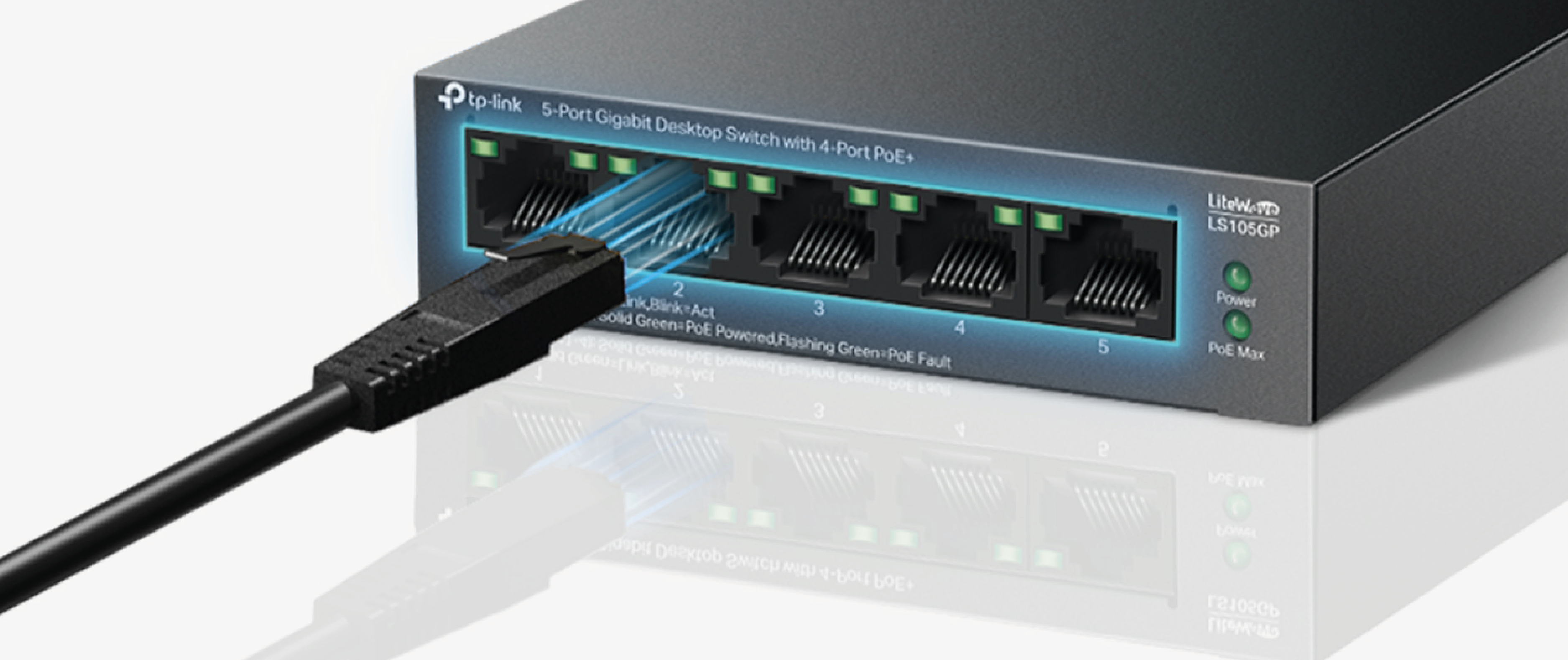 TP-Link LS105GP to biurkowy przełącznik niezarządzalny wyposażony w łącznie 5 gigabitowych portów Ethernet (10/100/1000 Mb/s), zapewniając szybką i stabilną łączność dla wszystkich podłączonych urządzeń w sieci lokalnej. Spośród tych portów, 4 porty Ethernet (Porty 1–4) obsługują zasilanie w standardzie PoE+ (802.3af/at), z maksymalną mocą wyjściową do 30 W na pojedynczy port, co umożliwia zasilanie urządzeń końcowych, takich jak punkty dostępowe Wi-Fi czy kamery IP. Łączny budżet mocy PoE dla całego urządzenia wynosi 64 W. LS105GP działa w trybie Plug and Play i nie wymaga konfiguracji ani zarządzania programowego, jednak oferuje on dwa tryby pracy przełączane za pomocą fizycznego suwaka: tryb "Extend" zwiększa zasięg zasilania i transmisji danych PoE na portach 1-4 do 250 metrów, kosztem ograniczenia przepustowości do 10 Mb/s, natomiast tryb "Priority" zapewnia priorytet zasilania portom o najwyższej numeracji w celu ochrony przed przeciążeniem całkowitego budżetu PoE w przypadku podłączenia zbyt wielu energochłonnych urządzeń. Urządzenie charakteryzuje się metalową obudową typu desktop i jest wyposażone w pasywne chłodzenie (bezwentylatorowe), co gwarantuje cichą pracę; switch można postawić na biurku lub półce albo zamontować na ścianie przy użyciu dołączonego zestawu.