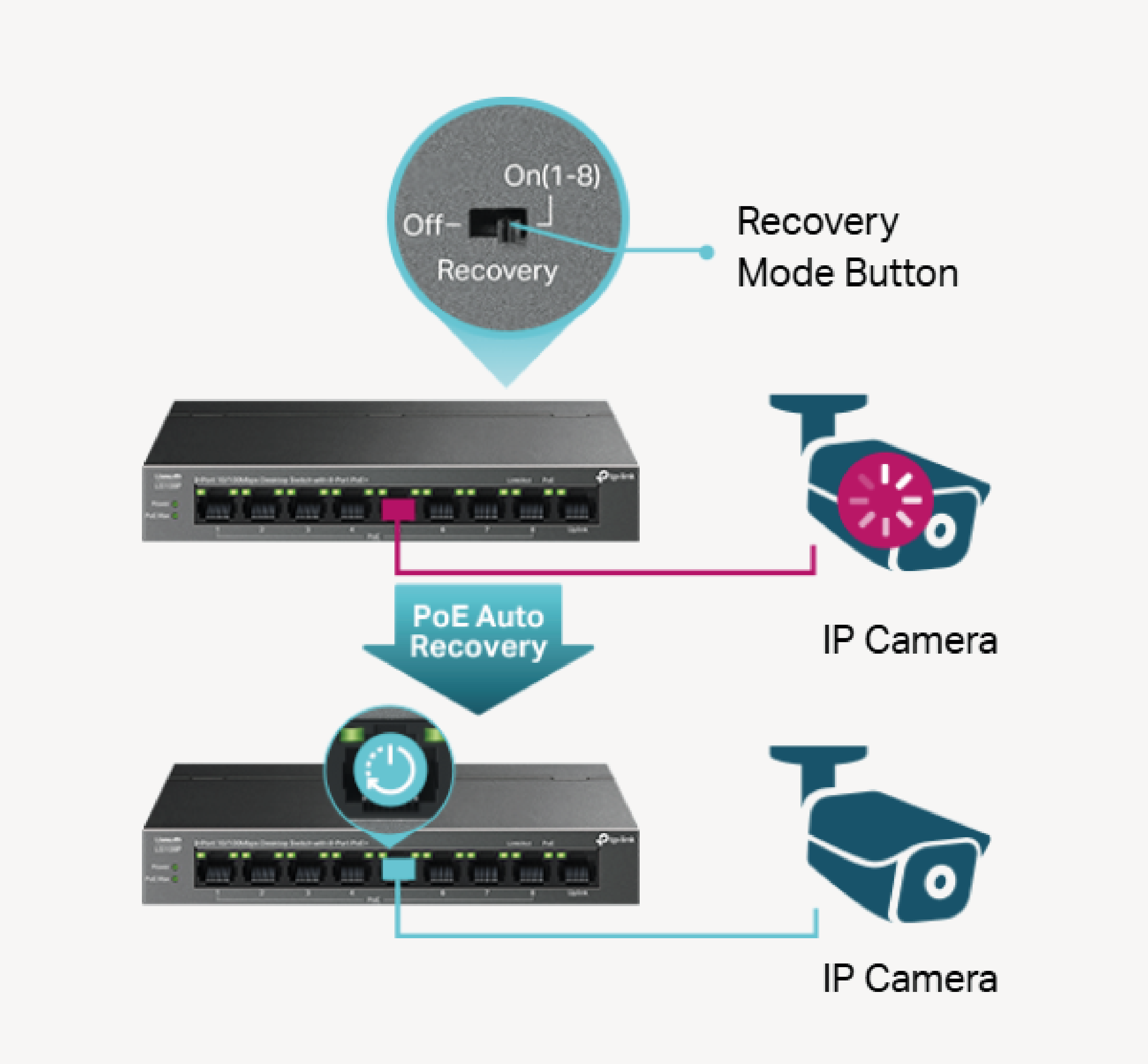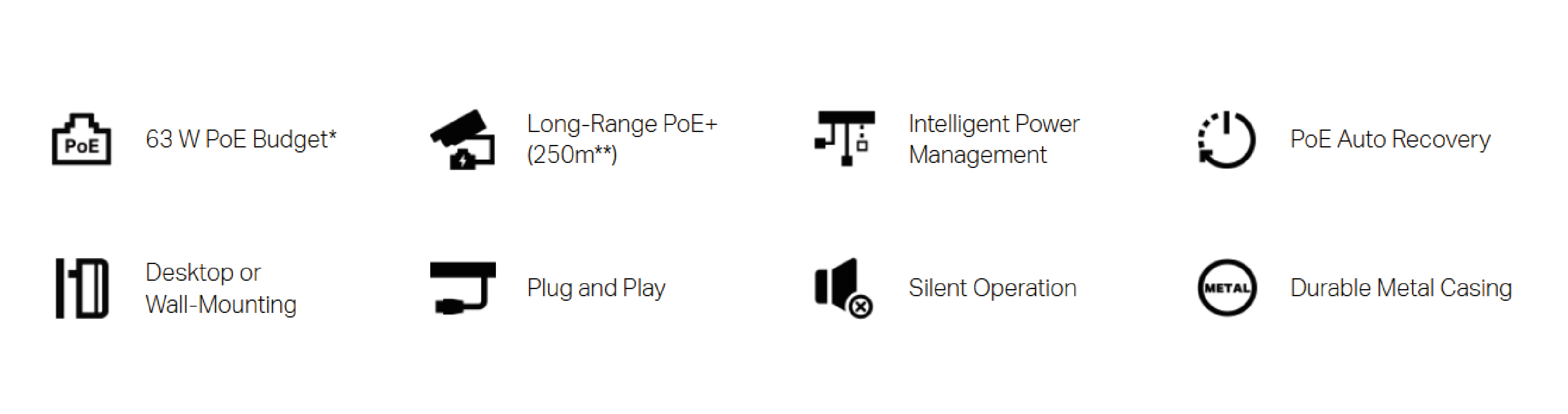 | Funkcje zaawansowane | Tryb Extend (Porty 1-4/1-8, do 250m transmisji zasilania PoE i danych) Tryb Isolation (Porty 1-8) PoE Auto Recovery (Porty 1-8) Zgodność z urządzeniami PoE IEEE 802.3af/at Automatyczna nauka i wygaszanie adresów MAC Kontrola przepływu IEEE 802.3x Technologia Green |
