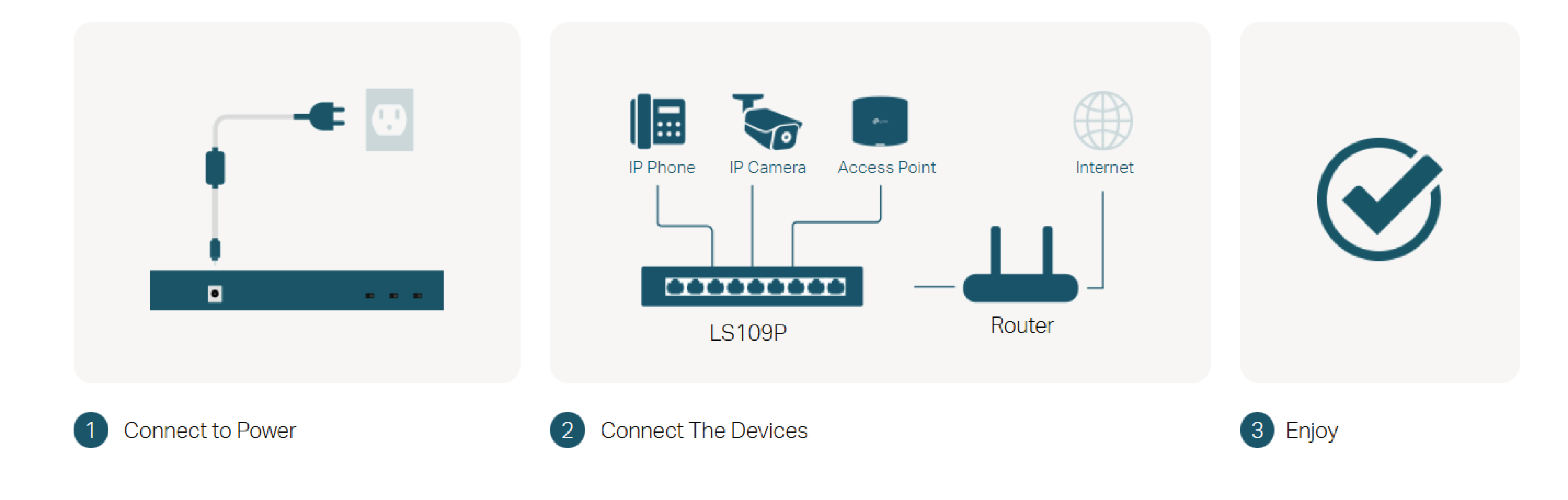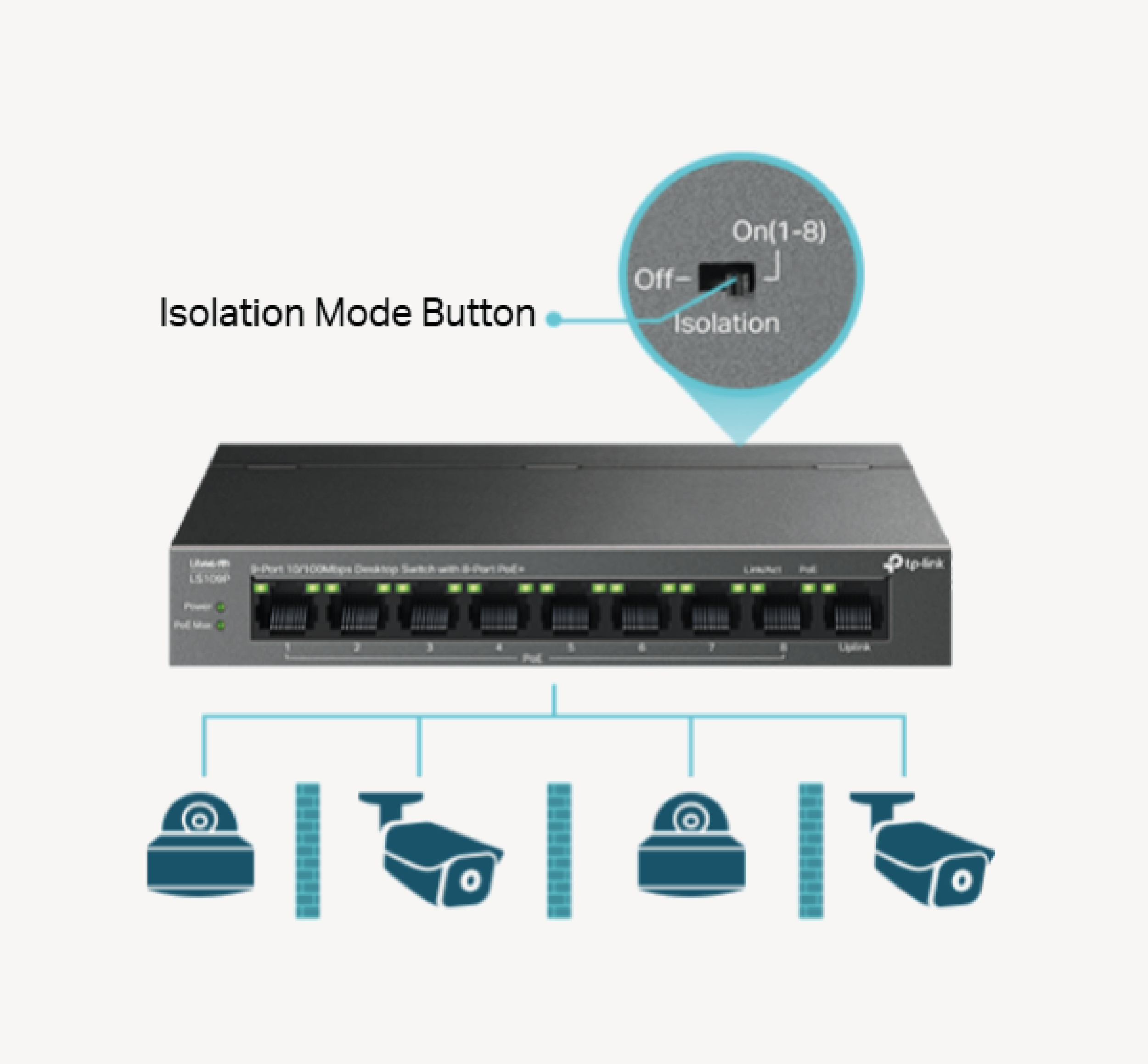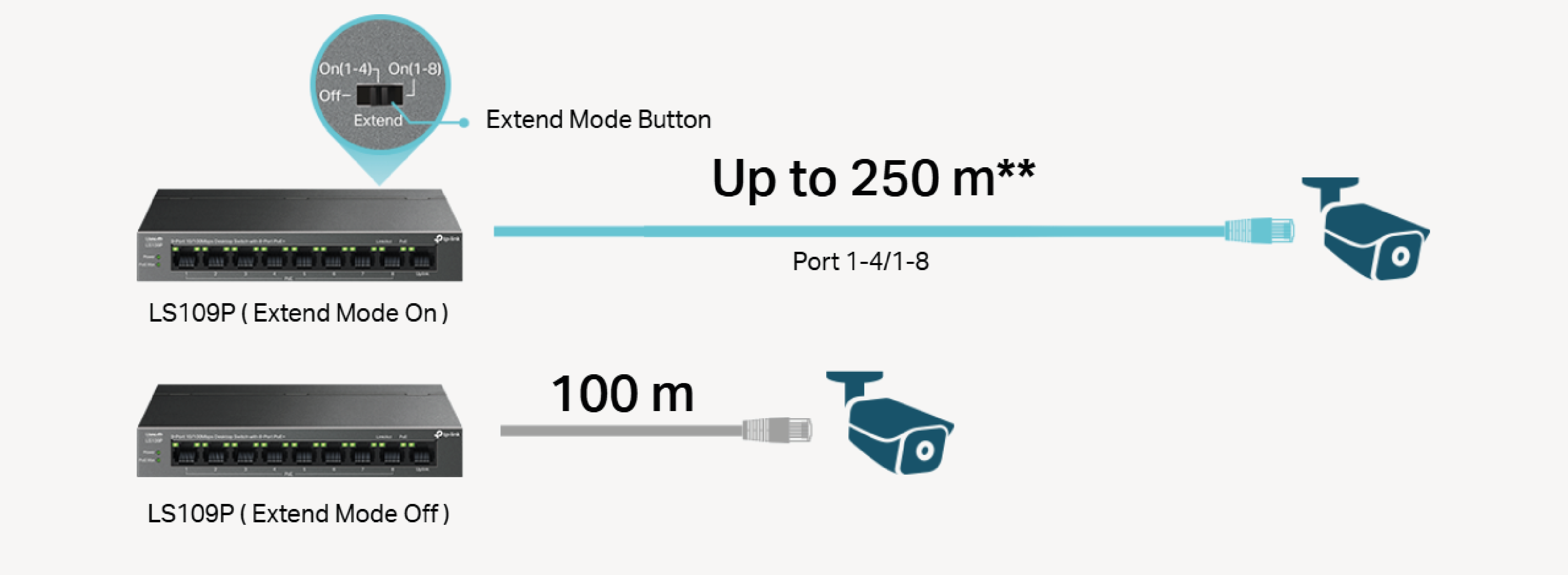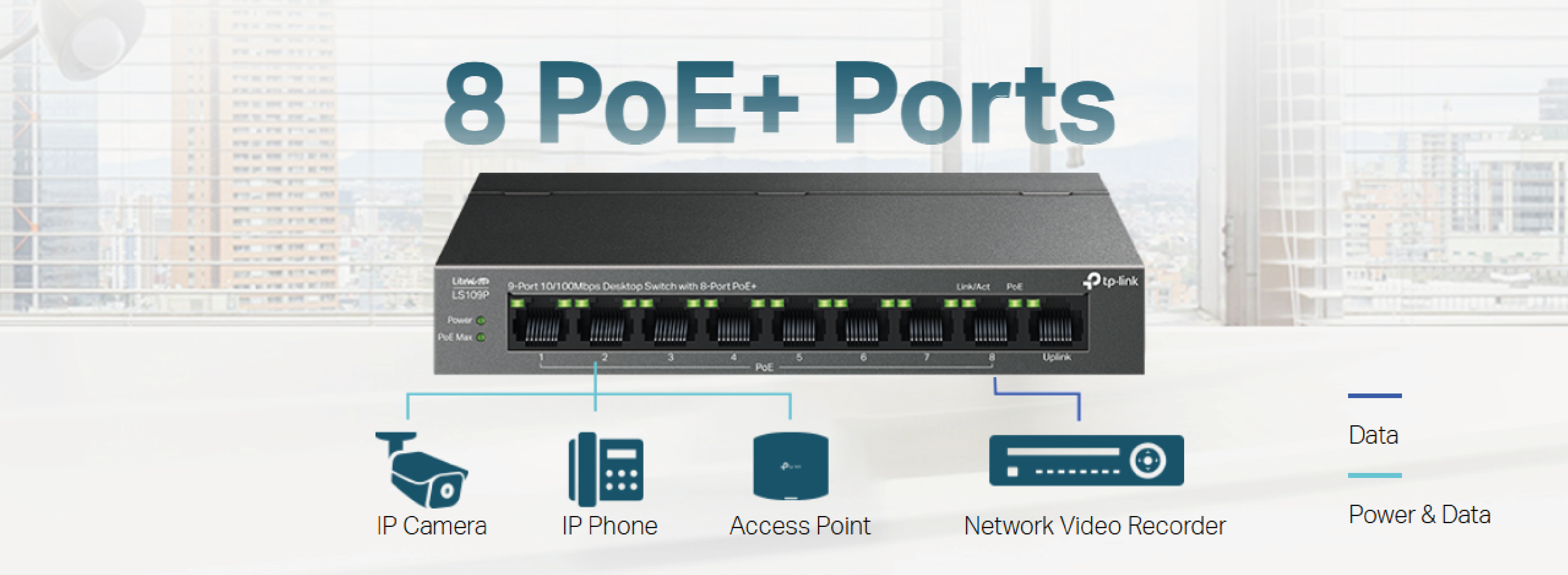 TP-Link LS109P to biurkowy przełącznik niezarządzalny wyposażony w łącznie 9 portów Fast Ethernet (10/100 Mb/s), zapewniając stabilną łączność dla wszystkich podłączonych urządzeń w sieci lokalnej. Spośród tych portów, 8 portów Ethernet (Porty 1–8) obsługuje zasilanie w standardzie PoE+ (802.3af/at), z maksymalną mocą wyjściową do 30 W na pojedynczy port, co umożliwia zasilanie urządzeń końcowych, takich jak punkty dostępowe Wi-Fi, telefony VoIP czy kamery IP. Łączny budżet mocy PoE dla całego urządzenia wynosi 65 W. LS109P działa w trybie Plug and Play i nie wymaga konfiguracji ani zarządzania programowego, jednak oferuje on dwa tryby pracy przełączane za pomocą fizycznego suwaka: tryb "Extend" zwiększa zasięg zasilania i transmisji danych PoE na portach 1-8 do 250 metrów, kosztem ograniczenia przepustowości do 10 Mb/s, natomiast tryb "Priority" zapewnia priorytet zasilania portom o najwyższej numeracji w celu ochrony przed przeciążeniem całkowitego budżetu PoE w przypadku podłączenia zbyt wielu energochłonnych urządzeń. Urządzenie charakteryzuje się metalową obudową typu desktop i jest wyposażone w pasywne chłodzenie (bezwentylatorowe), co gwarantuje cichą pracę; switch można postawić na biurku lub półce albo zamontować na ścianie przy użyciu dołączonego zestawu.