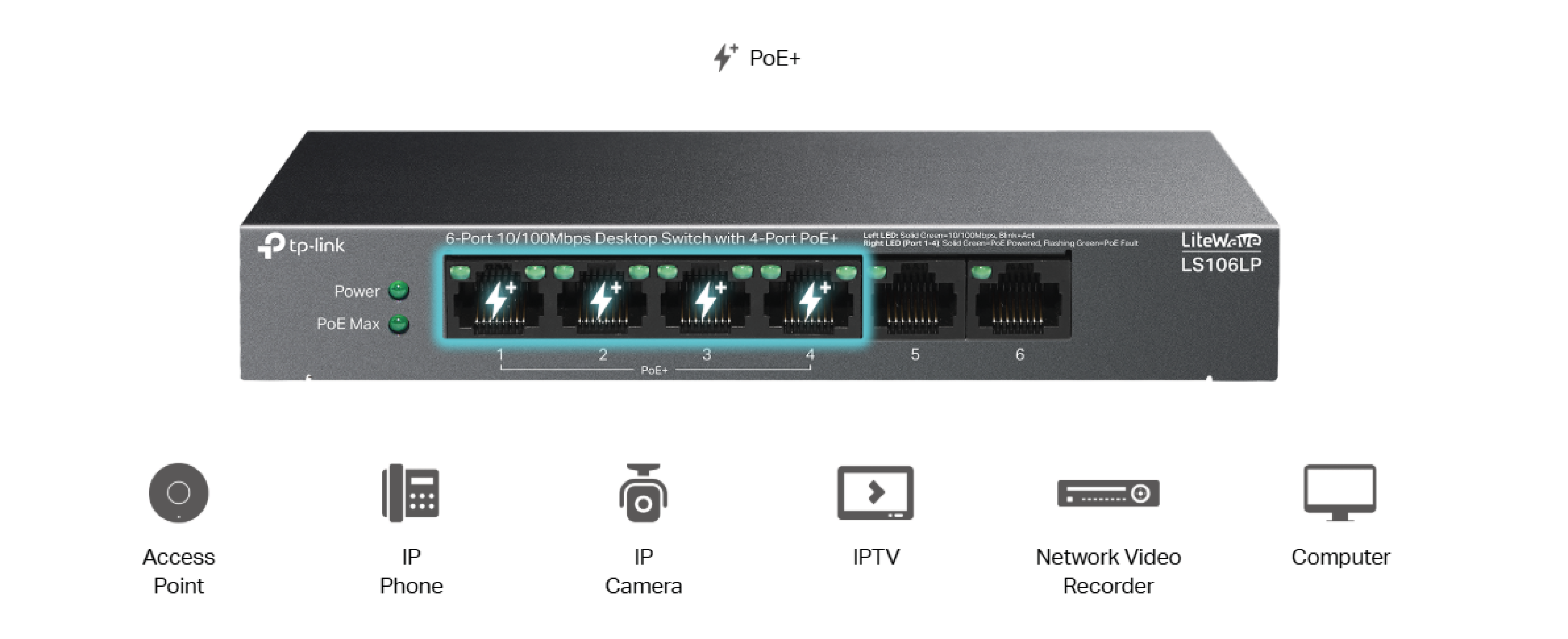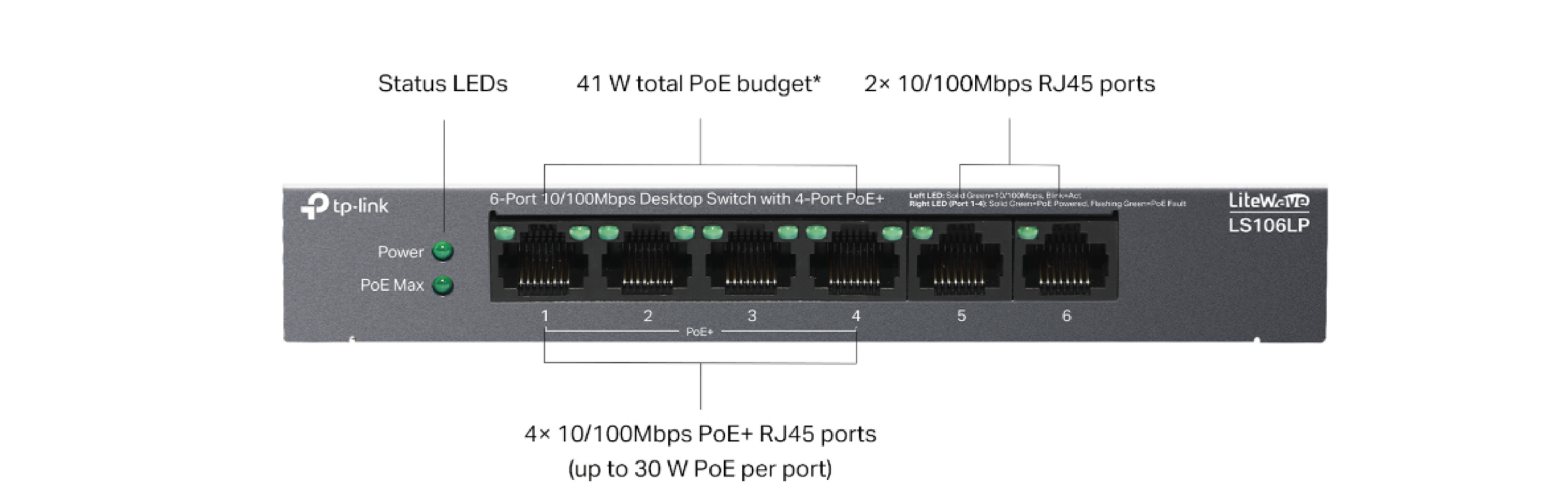 TP-Link LS106LP to biurkowy przełącznik niezarządzalny wyposażony w łącznie 6 portów Fast Ethernet (10/100 Mb/s), zapewniając stabilną łączność dla wszystkich podłączonych urządzeń w sieci lokalnej. Spośród tych portów, 4 porty Ethernet (Porty 1–4) obsługują zasilanie w standardzie PoE+ (802.3af/at), z maksymalną mocą wyjściową do 30 W na pojedynczy port, co umożliwia zasilanie urządzeń końcowych, takich jak punkty dostępowe Wi-Fi, telefony VoIP czy kamery IP. Łączny budżet mocy PoE dla całego urządzenia wynosi 40 W. LS106LP działa w trybie Plug and Play i nie wymaga konfiguracji ani zarządzania programowego, jednak oferuje on dwa tryby pracy przełączane za pomocą fizycznego suwaka: tryb "Extend" zwiększa zasięg zasilania i transmisji danych PoE na portach 1-4 do 250 metrów, kosztem ograniczenia przepustowości do 10 Mb/s, natomiast tryb "Priority" zapewnia priorytet zasilania portom o najwyższej numeracji w celu ochrony przed przeciążeniem całkowitego budżetu PoE w przypadku podłączenia zbyt wielu energochłonnych urządzeń. Urządzenie charakteryzuje się metalową obudową typu desktop i jest wyposażone w pasywne chłodzenie (bezwentylatorowe), co gwarantuje cichą pracę; switch można postawić na biurku lub półce albo zamontować na ścianie przy użyciu dołączonego zestawu.
