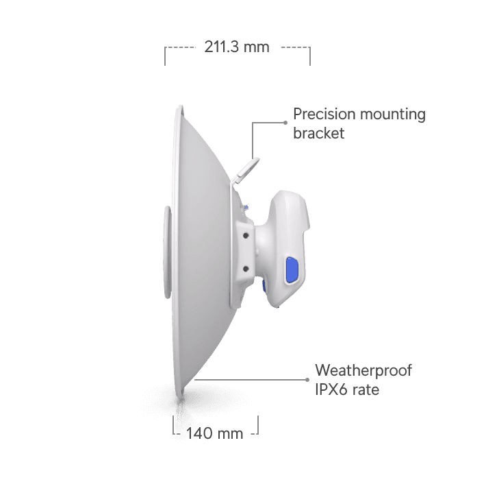 Zysk energetyczny anteny wynosi 26 dBi, co, wg danych producenta, powinno wystarczyć do stworzenia połączenia punkt-punkt na odległość maksymalnie 30 km. Pomimo dobrej wydajności antena charakteryzuje się niewielkimi wymiarami, jej średnica wynosi tylko 42 cm.