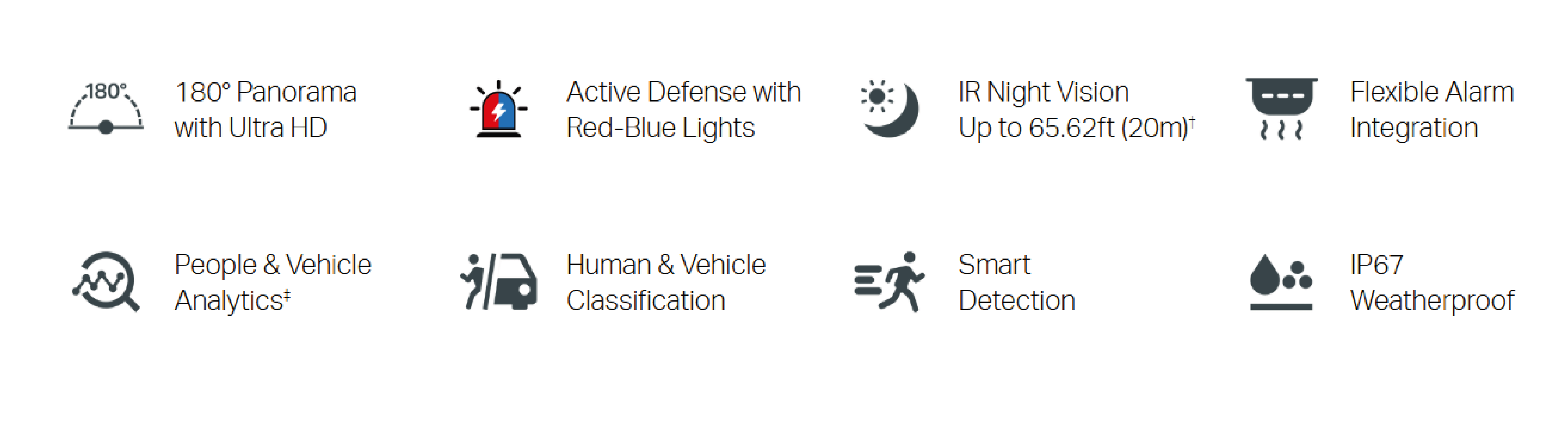 | Zdarzenia Smart | Wykrywanie wtargnięcia Wykrywanie przekroczenia linii Wykrywanie wejścia do strefy Wykrywanie wyjścia ze strefy Wykrywanie pozostawienia obiektu Wykrywanie zabrania obiektu Wykrywanie włóczęgi Wykrywanie ludzi Wykrywanie pojazdów Wykrywanie nieoczekiwanego dźwięku Wykrywanie zmiany sceny |