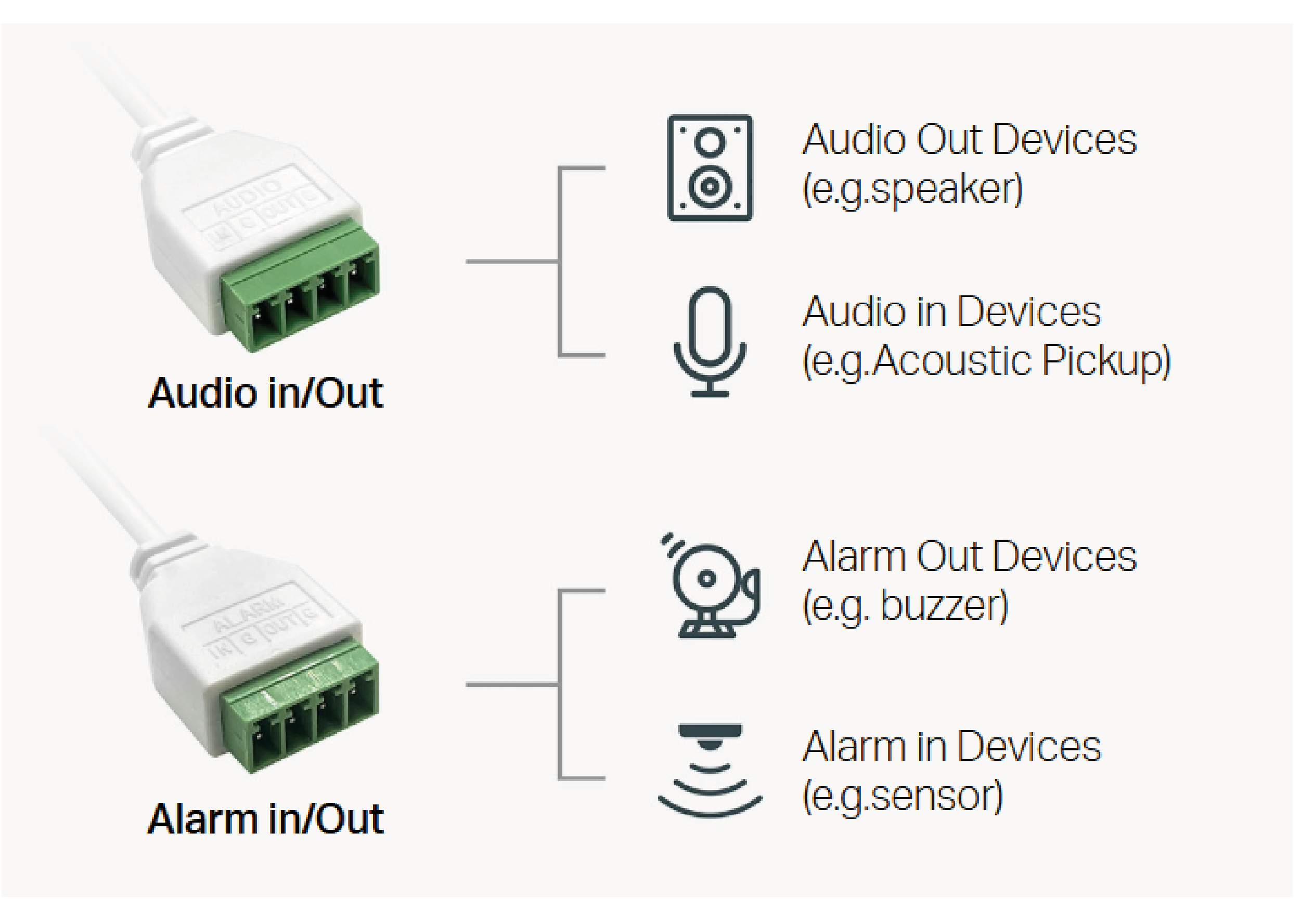 Porty wejściowe/wyjściowe audio i alarmu umożliwiają łatwą integrację z zewnętrznymi alarmami.