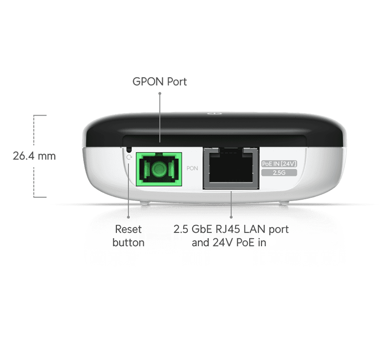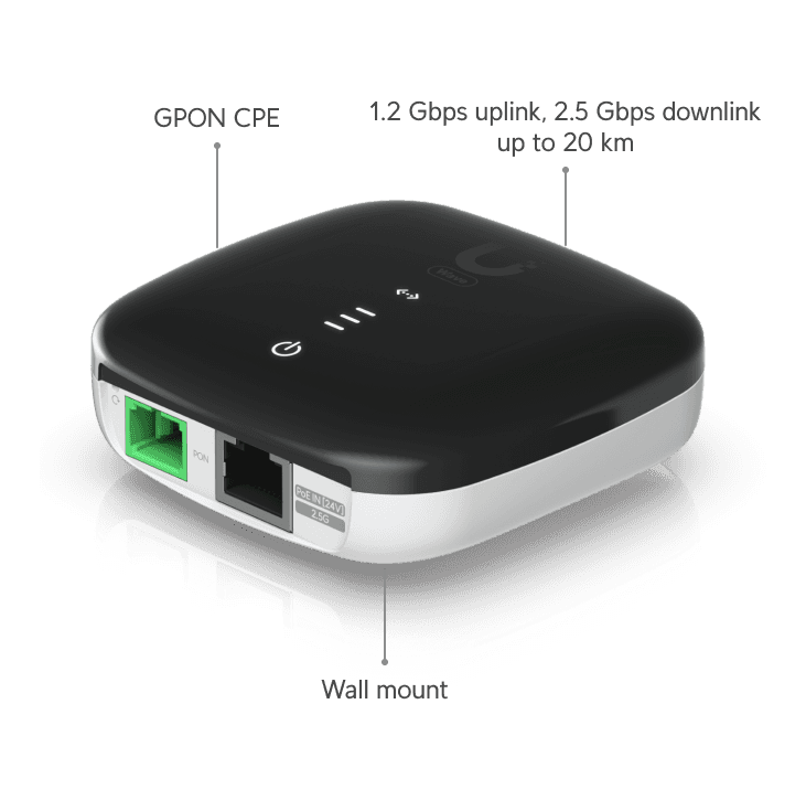 Ubiquiti WaveFiber ONU to terminal kliencki przeznaczony do sieci GPON, do współpracy z terminalami OLT marki Ubiquiti. Urządzenie posiada 1 port 2.5G Ethernet, który pozwoli uzyskać maksymalną przepustowość standardu GPON i umożliwi oferowanie abonentom pakietów danych powyżej 1 Gb/s. Port Ethernet służy jednocześnie za wejście zasilania pasywnego PoE (24 V DC), zasilania nie można doprowadzić w inny sposób. WaveFiber ONU wspiera tryb bridge i routera, posiada również inne, przydatne funkcje, takie jak zapora sieciowa (firewall). Producent zastosował złącze SC/APC, zakres mocy nadawczej wynosi 1,5 ~ 5 dBm, a zakres czułości odbioru -8 ~ -28 dBm.