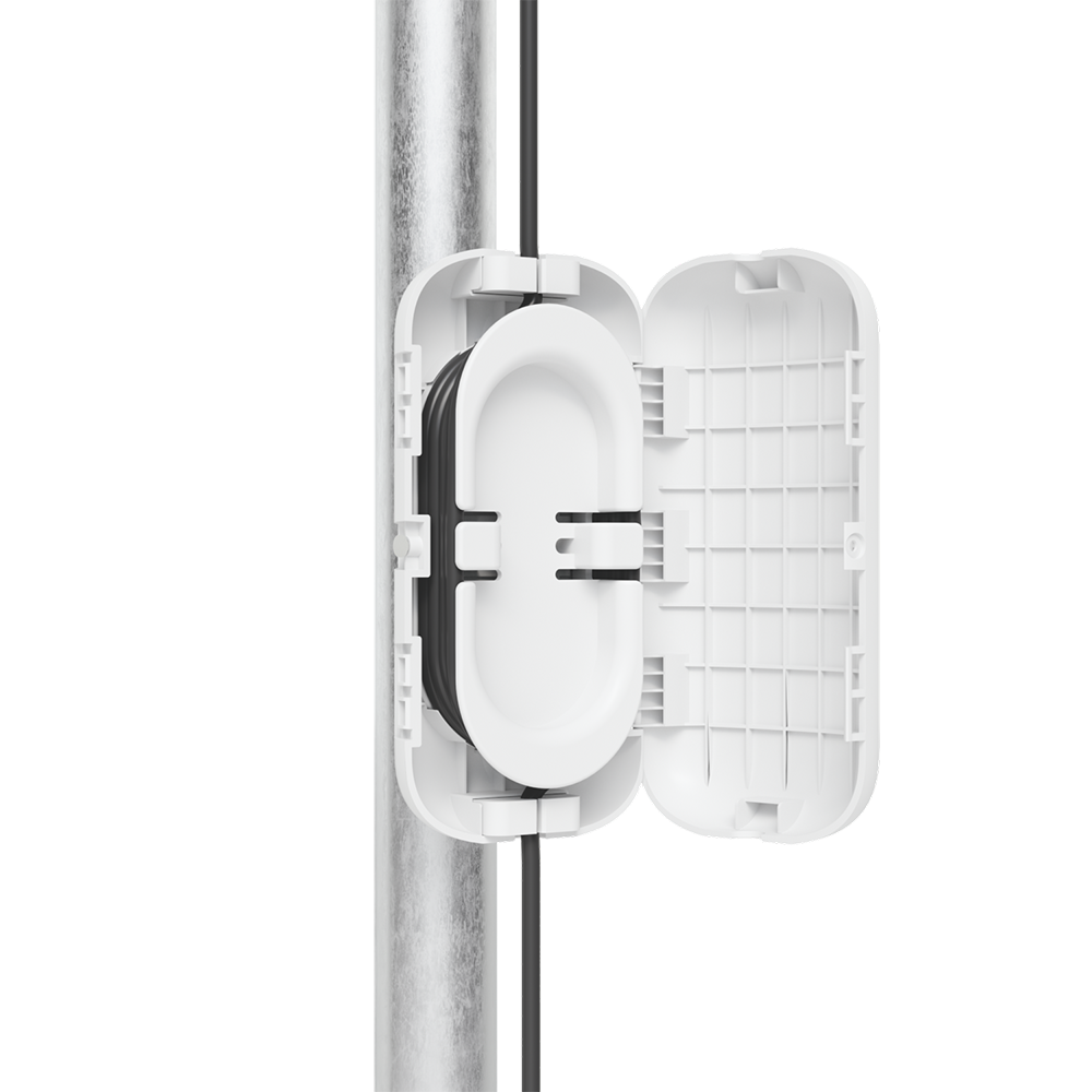 Oferowany produkt to puszka / skrzynka wykonana z poliwęglanu odpornego na promieniowanie UV. Jest w pełni przystosowana do montażu na zewnątrz budynków na słupie lub ścianie, w zestawie znajdziesz metalową opaskę oraz kołki montażowe. Puszka służy do schowania wewnątrz zapasu kabla światłowodowego, sprawdzi się podczas wielu instalacji.