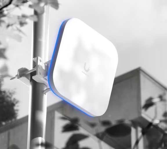 Ubiquiti E7 Campus to punkt dostępowy z serii Enterprise przeznaczony do wykorzystania w systemie UniFi. Posiada obudowę przystosowaną do wykorzystania na zewnątrz budynków. Może pracować w pasmach 2,4 i 5 GHz, łącznie posiada 3 radia (jedno z 2,4 GHz, dwa w 5 GHz). Wspiera protokoły IEEE 802.11 b/g/n/ax/be w 2,4 GHz i IEEE 802.11 a/n/ac/ax/be w 5 GHz, maksymalna teoretyczna przepustowość wynosi odpowiednio 688 Mbs w 2,4 GHz oraz 8,6 Gb/s w 5 GHz. Taka prędkość jest możliwa dzięki zastosowaniu trzech radiów (dwa w paśmie 5 GHz) i łącznie 10 strumieni MIMO. E7 Campus w przeciwieństwie do standardowych punktów dostępowym posiada anteny kierunkowe, a nie dookólne, co pozwala skupić sygnał na najważniejszym obszarze. W paśmie 2,4 GHz zysk energetyczny wynosi 9 dBi (kształt wiązki 90° x 80°), a w paśmie 5 GHz 12 dBi (100° x 55°). To przekłada się na bardzo dobry zasięg połączenia, który wg danych producenta wynosi do 465 m2. Należy pamiętać, że punkt dostępowy powinien być zamontowany odpowiednio wysoko, aby objąć zasięgiem najważniejszy obszar. Urządzenie posiada 1 port 10G Ethernet oraz 1 port 1G Ethernet, na obu znajduje się wejście zasilania PoE++ (802.3bt), zasilania nie można doprowadzić w inny sposób. W założeniu port 10GE ma pełnić rolę portu głównego, natomiast port 1GE możesz użyć do zapewniania awaryjnego połączenia, które będzie wykorzystywane w przypadku awarii połączenia głównego. Punkt dostępowy jest przystosowany do montażu na ścianie lub słupie, dołączony uchwyt pozwoli ci regulować kąt nachylenia.