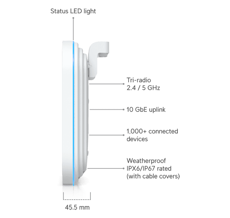 Punkt dostępowy został zaprojektowany do pracy pod kontrolą systemu UniFi, wymaga odpowiedniego kontrolera i nie posiada trybu stand-alone. Może transmitować sieć bezprzewodową Wi-Fi 7 w dwóch pasmach, korzystając z łącznie trzech transmisji. Używa protokołów IEEE 802.11 b/g/n/ax/be w 2,4 GHz i IEEE 802.11 a/n/ac/ax/be w 5 GHz, w paśmie 5 GHz prowadzone są dwie transmisje. Maksymalna teoretyczna przepustowość wynosi odpowiednio 688 Mb/s w 2,4 GHz oraz 8,6 Gb/s w 5 GHz.