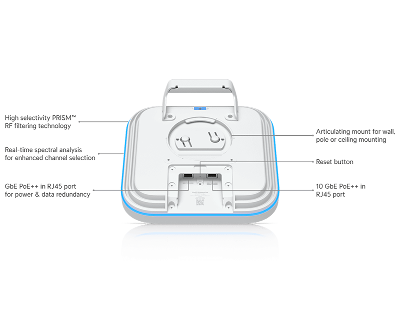 Punkt dostępowy należy do serii produktów Enterprise, które wyróżniają się większą wydajnością od standardowych rozwiązań UniFi. Dzięki zastosowaniu aż 10 strumieni MIMO i trzech pasm pracy jest w stanie uzyskać bardzo dużą przepustowość i obsłużyć wielu użytkowników jednocześnie (1000). Zastosowanie dwóch portów pozwoli ci przygotować cała sieć w trybie failover - w odpowiedniej konfiguracji możesz zabezpieczyć się przed awarią switchy / bram / kontrolerów.