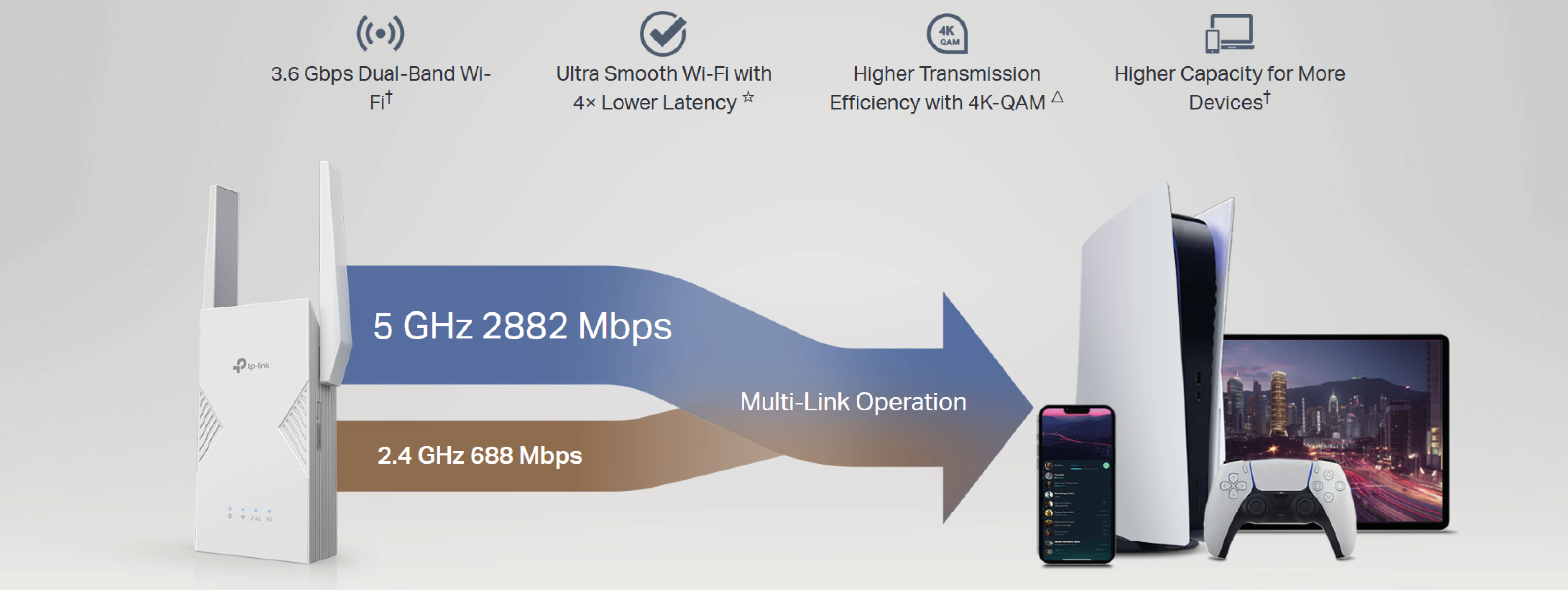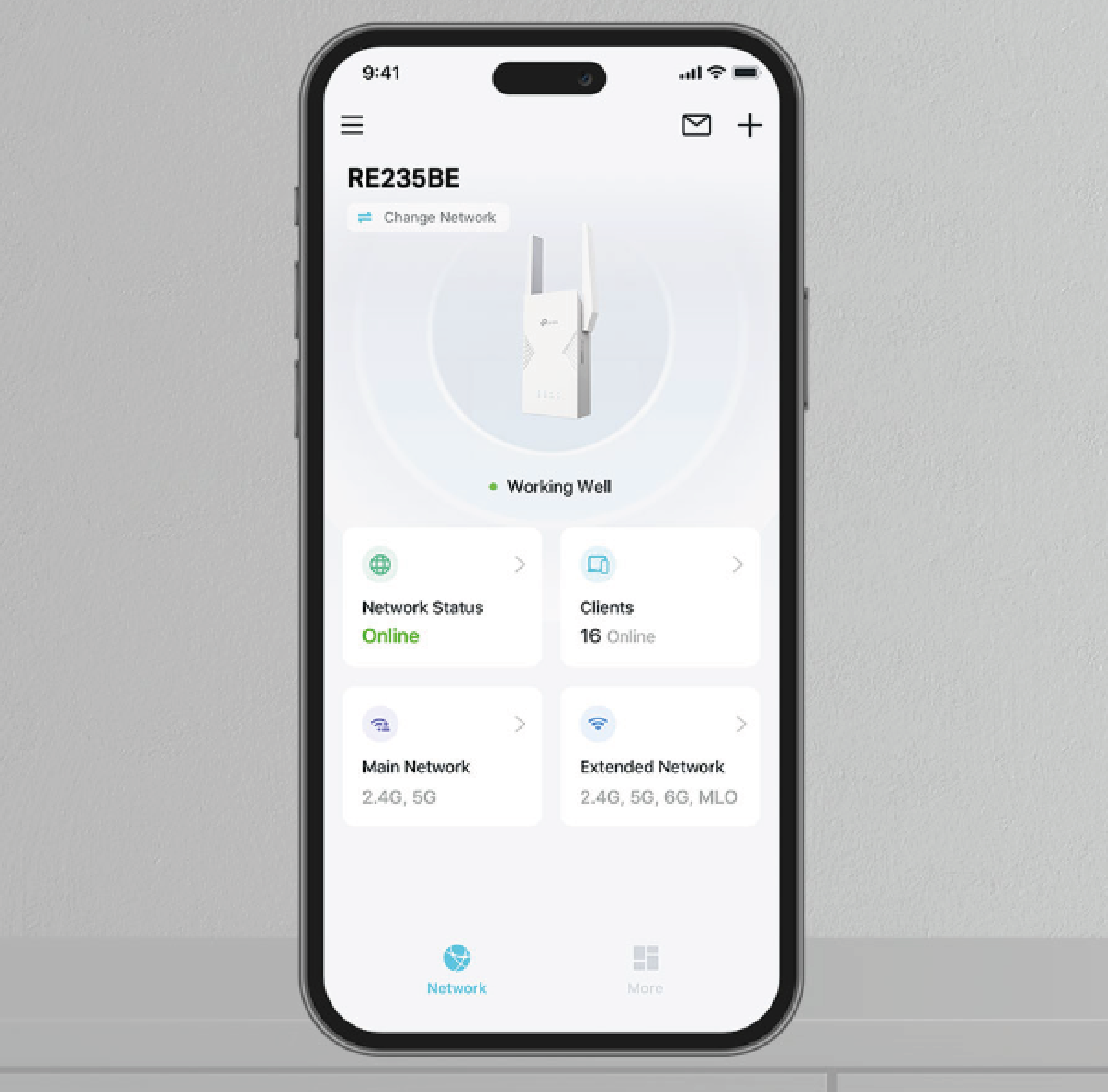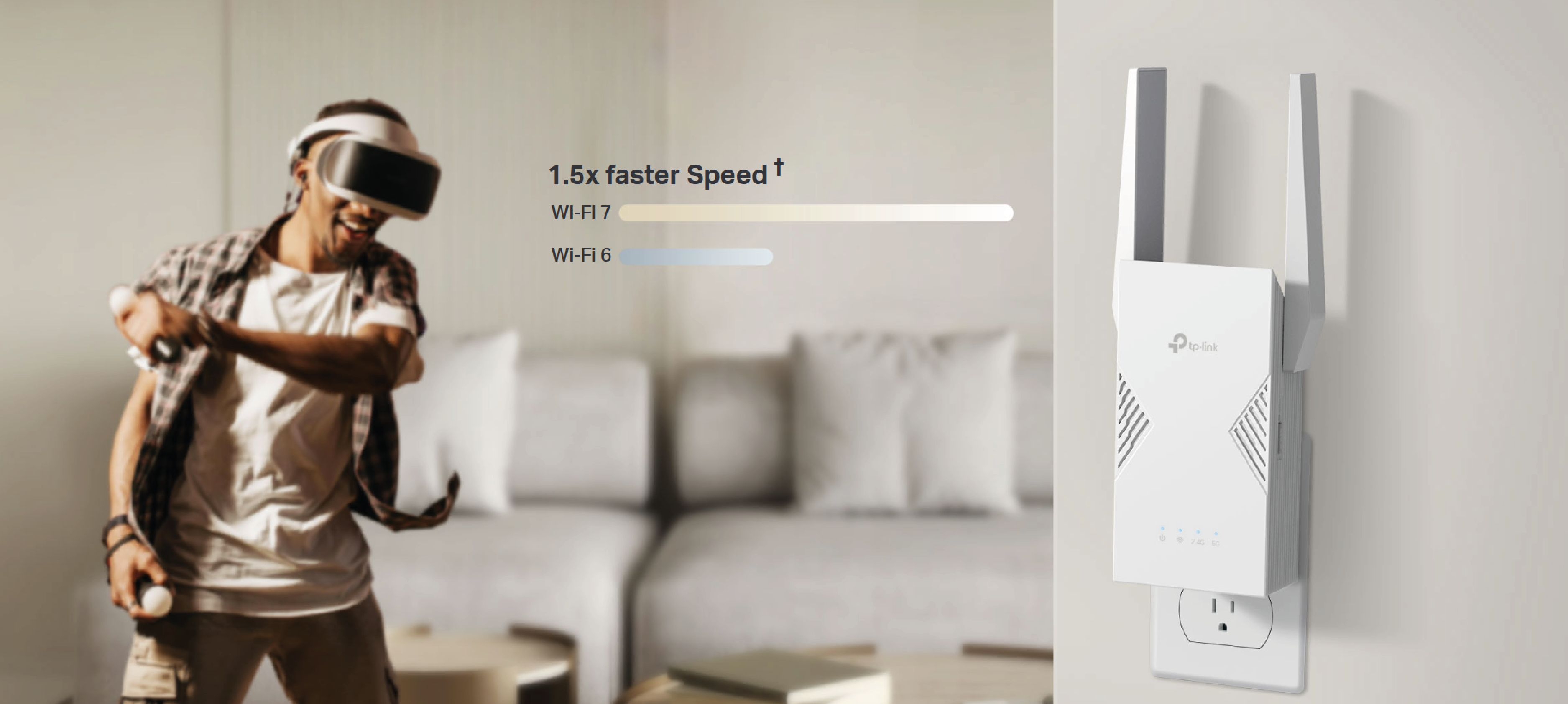 Doświadcz wydajności gotowej na przyszłość dzięki naszemu wzmacniaczowi sygnału Wi-Fi 7, oferującemu prędkość do 3,6 Gb/s† w każdym zakątku Twojego domu. Zwiększ możliwości połączeń dla swoich urządzeń dzięki dedykowanemu pasmu 5GHz† które zapewnia wysoką przepustowość i niezawodność.