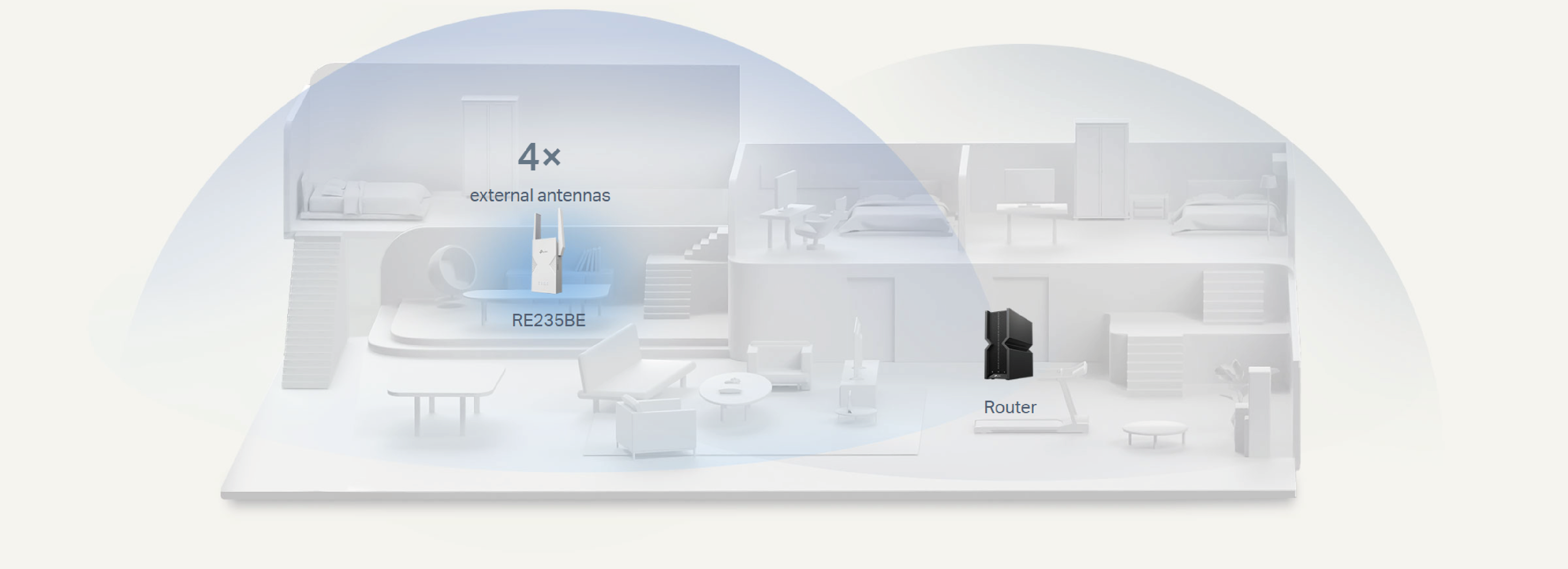 RE235BE to dwupasmowy wzmacniacz sygnału bezprzewodowego (range extender) w standardzie Wi-Fi 7 (802.11be), przeznaczony do rozszerzania zasięgu istniejącej sieci Wi-Fi. Urządzenie zapewnia łączną teoretyczną przepustowość do 3,6 Gb/s (BE3600), pracując jednocześnie w pasmach 2,4 GHz i 5 GHz. Wykorzystuje technologię Wi-Fi 7, w tym modulację 4096-QAM (4K-QAM) i szerokość kanału do 160 MHz w paśmie 5 GHz, w celu zwiększenia wydajności i gęstości transmisji danych w obszarach o słabym pokryciu sygnałem routera głównego. Wzmacniacz wyposażony jest w port Gigabit Ethernet (1 Gb/s), umożliwiający podłączenie urządzenia przewodowego lub wykorzystanie wzmacniacza w trybie punktu dostępowego. Używa protokołów szyfrowania WPA3 i jest konfigurowany za pomocą interfejsu webowego lub aplikacji mobilnej. Jego funkcja polega na retransmisji sygnału z routera, a nie na pełnieniu funkcji routera głównego (nie zarządza adresacją IP).
