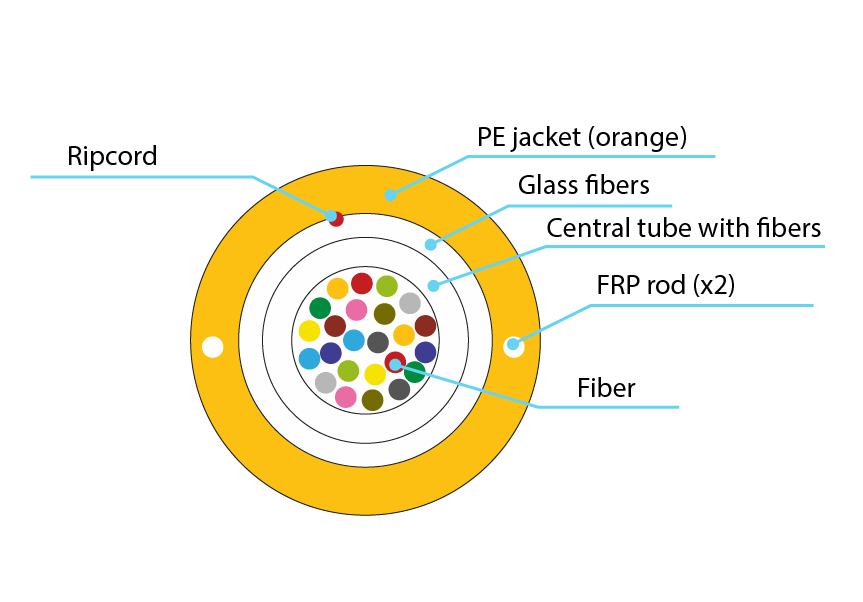 Kabel posiada jedną, centralnie umieszczoną tubę wewnątrz której znajdują się dwa włókna optyczne. Produkt został wzmocniony dwoma prętami FRP, dodatkowo cała konstrukcja jest wzmocniona obwodowo włóknem szklanym. Kabel wyróżnia się bardzo dużą odpornością na zgniatanie - do 4 kN, dzięki czemu jest odporny na nacisk, który występuje podczas montażu bezpośrednio w gruncie.