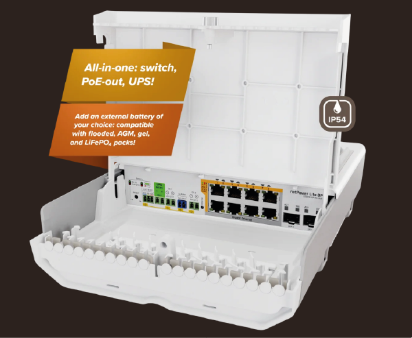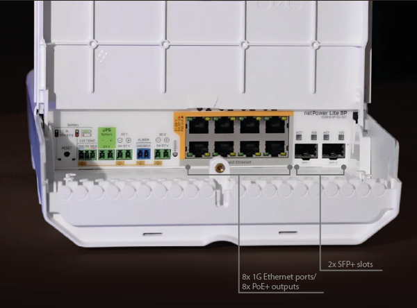MikroTik netPower Lite 8P to switch wyposażony w 8 gigabitowych portów Ethernet (10/100/1000 Mb/s) oraz 2 sloty SFP+ (10 Gb/s). Na każdym porcie Ethernet znajduje się wyjście zasilania PoE+ (802.3af/at), maksymalny budżet mocy na port wynosi 30 W, a na całe urządzenie 120 W (budżet uzależniony jest od zastosowanego zasilacza, zasilacz należy dokupić osobno). Switch posiada obudowę przystosowaną do montażu na zewnątrz budynku, stopień ochrony IP55. W zestawie znajdziesz uchwyt pozwalający przymocować urządzenie na słupie. Najważniejszą zaletą netPower Lite 8P jest zintegrowana funkcja UPSa - do switcha możesz podłączyć zewnętrzne akumulatory (napięcie wejściowe 24 V DC). Do urządzenia możesz podłączyć zewnętrzny czujnik temperatury, port alarmowy pozwoli ci stworzyć proste (2 żyłowe) raportowanie stanu pracy. Prąd ładowania wynosi 0,2 - 1,6 A, a napięcie 20 - 31,7 V. Oferowany produkt posiada system SwOS, który umożliwia zarządzanie w warstwie Layer 2.