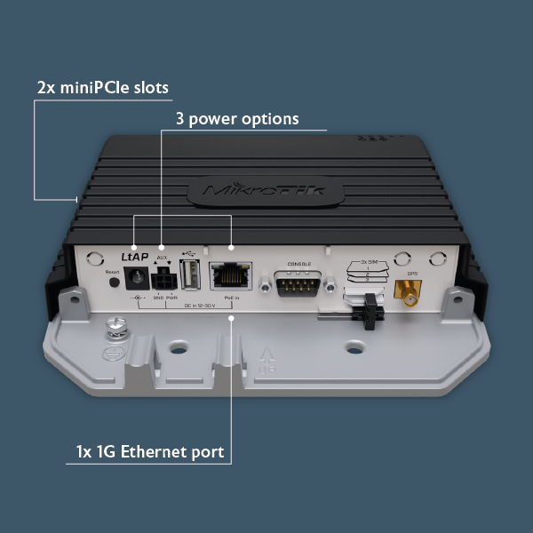Router został wyposażony w 1 port 1G Ethernet (10/100/1000 Mb/s), który jednocześnie służy za wejście zasilania PoE (pasywne PoE 12 - 30 V DC). Zasilanie możesz doprowadzić również korzystając ze standardowego gniazda DC lub złącza automotive. Wewnątrz obudowy znajdują się dwa sloty miniPCIe, w jednym z nich jest już zamontowany modem LTE, drugi możesz wykorzystać do montażu dodatkowego modemu / karty radiowej, zgodnie z zapotrzebowaniem.