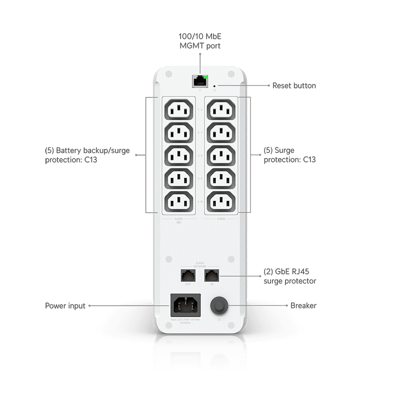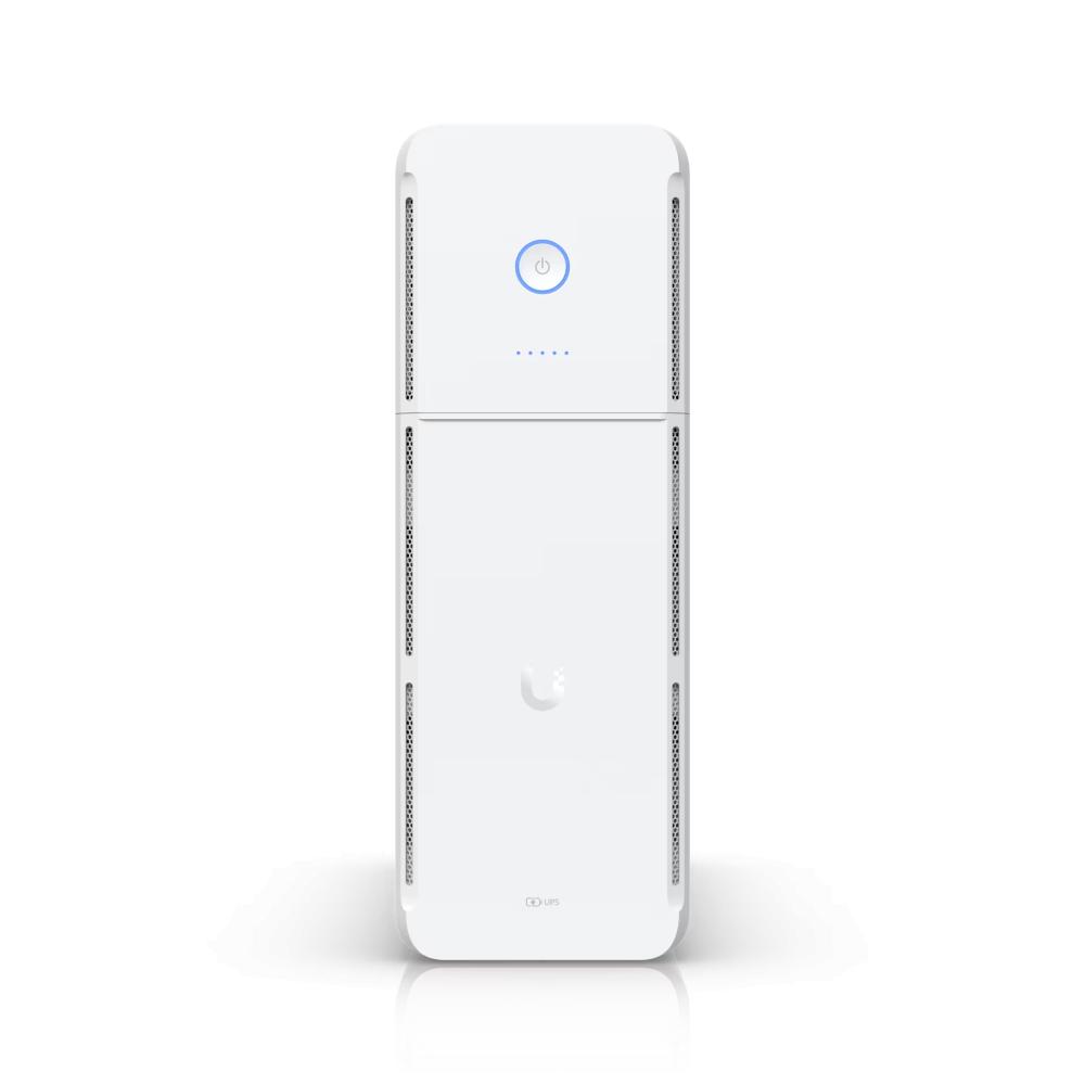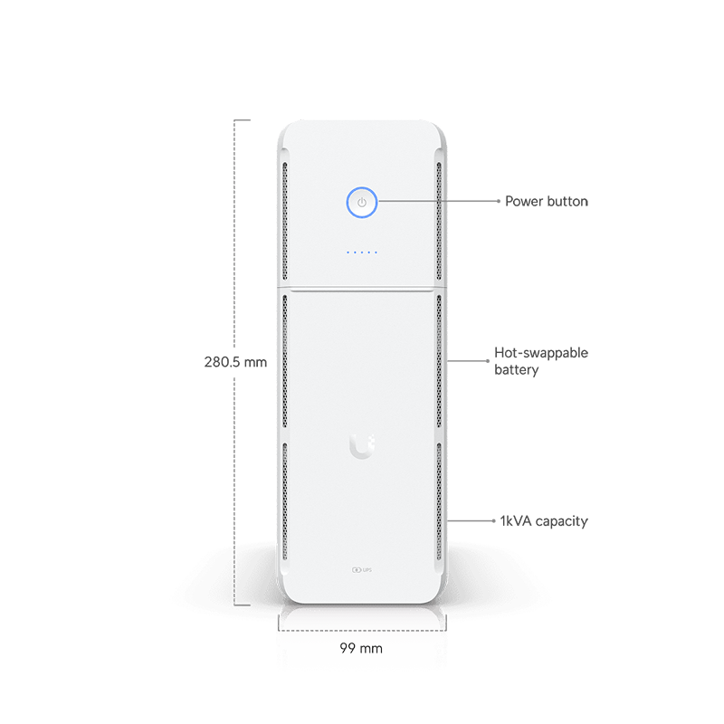 Ubiquiti UPS Tower to UPS z możliwością zarządzania z poziomu systemu UniFi. Wewnątrz znajduje się akumulator 12 V o pojemności 9 Ah, który możesz wymienić w trakcie pracy urządzenia (hot-swap). Wg danych producenta przy obciążeniu 50% (300 W) zastosowana bateria wystarczy na 7 minut pracy. Z tyłu obudowy znajdziesz 5 gniazd C13, które zapewnią zasilanie awaryjne podłączonych urządzeń. Dodatkowy drugi rząd gniazd C13 służy tylko do ochrony przepięciowej. Ponadto UPS posiada dwa porty 1G Ethernet do ochrony przepięciowej jednego połączenia. Urządzenie wspiera funkcje Graceful Shutdown (do UNVR oraz UNAS) i dodatkowo NUT (Network UPS Tools) do współpracy z rozwiązaniami innych producentów.