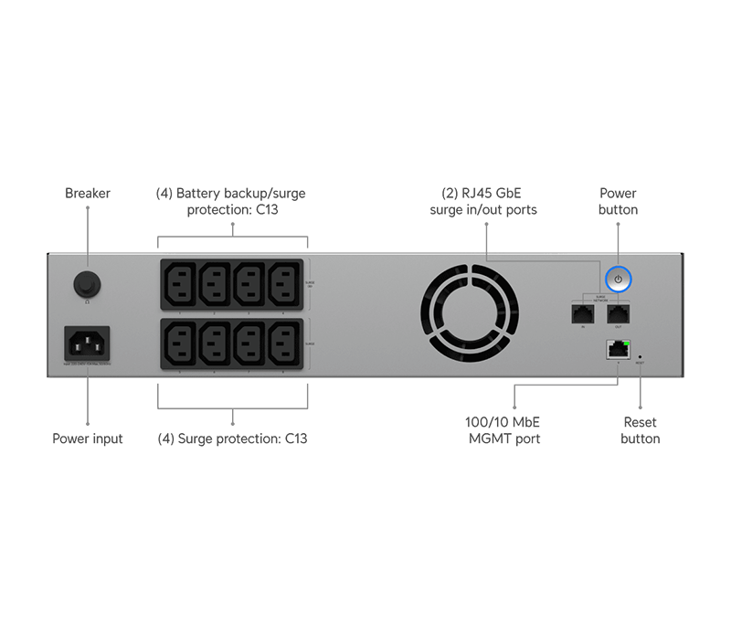 Z tyłu obudowy znajduje się łącznie 8 gniazd C13 podzielonych na dwie partie. 4 gniazda umieszczone na górze zapewniają zasilanie awaryjne i ochronę przepięciową, gniazda na dole zapewniają tylko ochronę przepięciową. Dodatkowo poniżej umieszczono dwa porty 1G Ethernet, które możesz zastosować do zabezpieczenia przepięciowego jednej transmisji Ethernet. Obudowa UPSa została przystosowana do montażu w szafie Rack 19", zajmuje wysokość 2U.