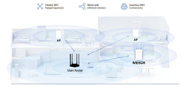 ME60X wspiera EasyMesh - jest to standard, który umożliwia łączenie urządzeń różnych producentów w obrębie jednej sieci Mesh. Tak stworzoną sieć użytkownik widzi pod jedną, zunifikowaną nazwą niezależnie od liczby routerów / AP, system automatycznie przełącza użytkowników pomiędzy poszczególnymi urządzeniami. Mesh jest znacznie lepszym rozwiązaniem od standardowego trybu wzmacniacza sygnału, wyróżnia się lepszą jakością transmisji oraz niższymi opóźnieniami.