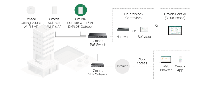 | Scentralizowane zarządzanie | Kontroler sprzętowy Omada Kontroler programowy Omada Omada Central (Oparta na Chmurze) Aplikacja Omada |