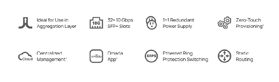 | Funkcje zaawansowane | Automatyczne wykrywanie urządzeń† Grupowa konfiguracja† Grupowa aktualizacja oprogramowania† Inteligentne monitorowanie sieci† Ujednolicona konfiguracja† Harmonogram restartów† Funkcje ISP: L2PT (Layer 2 Protocol Tunneling) Device Link Detect Protocol (DLDP) PPPoE ID Insertion ERPS 802.3ah Ethernet Link OAM DDM sFlow |
