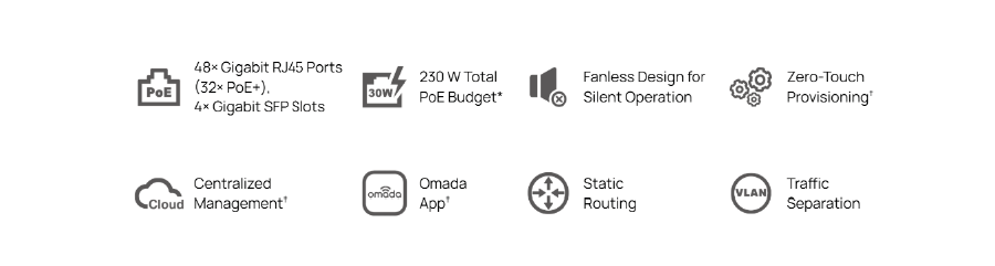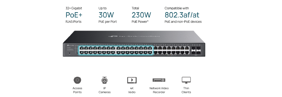 | Porty PoE (RJ45) | Zgodność ze standardami: 802.3at/af 32 porty PoE+, do 30 W na port Łączna moc zasilania PoE: 230 W* |
