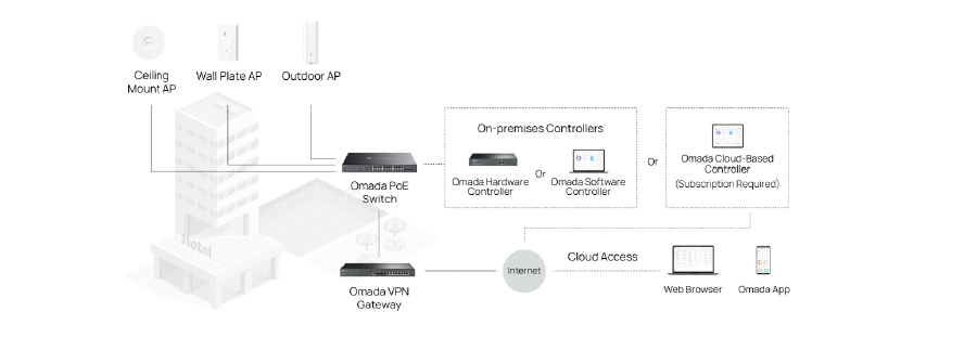 | Scentralizowane zarządzanie | Kontroler Omada oparty na Chmurze Kontroler sprzętowy Omada Kontroler programowy Omada |