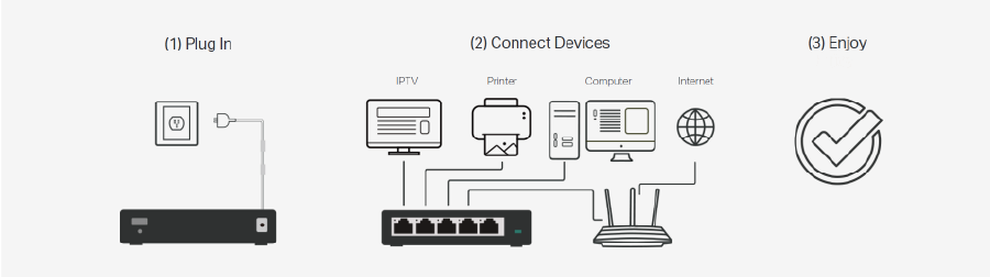 Funkcja Plug and Play sprawia, że instalacja przełącznika jest niezwykle szybka i łatwa. Automatyczna negocjacja połączeń umożliwia automatyczne wykrywanie prędkości urządzeń podłączonych do każdego z portów, zapewniając kompatybilność i optymalną wydajność transmisji.