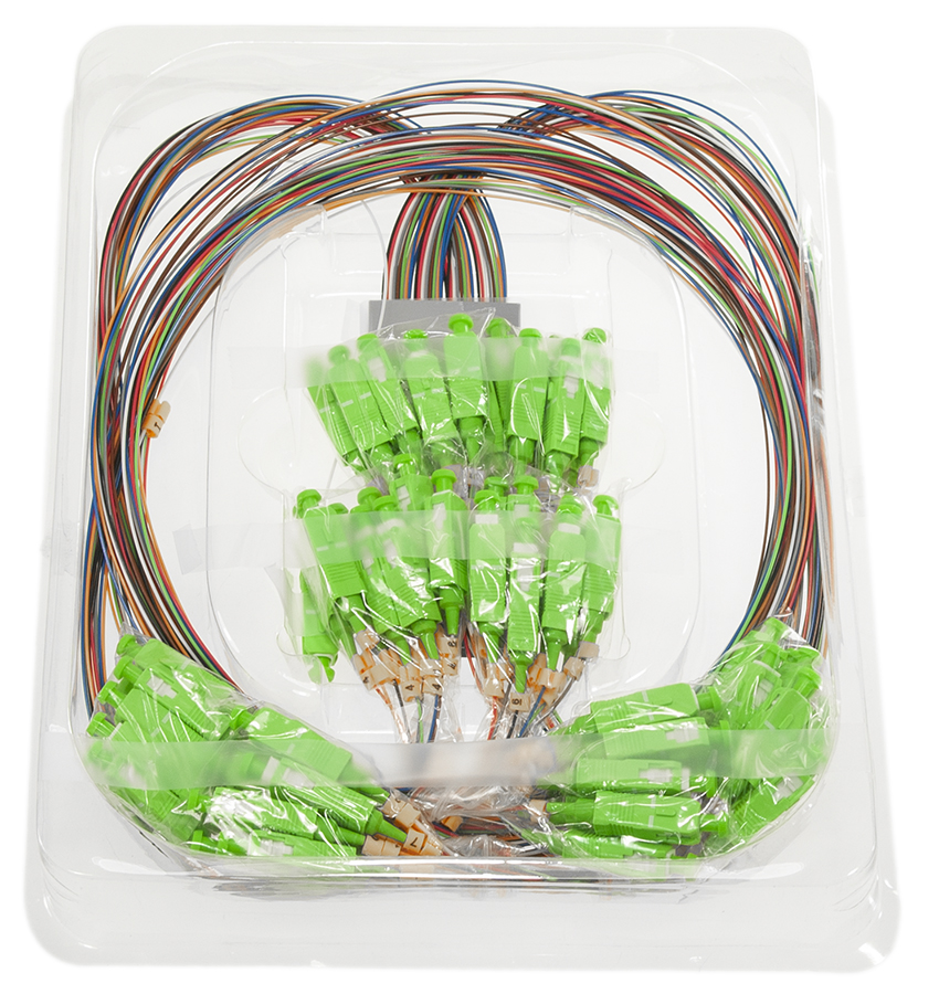 Splitter optyczny 1x64 (jedno wejście, sześćdziesiąt cztery wyjścia) z symetrycznym podziałem mocy (1,5625% na każdym wyjściu). Posiada obudowę typu steel box, średnica zewnętrzna kabla wynosi 0,9 mm, a jego długość 1 m. Zastosowano włókno singlemode typu G.657.A1. Symetryczne splittery są podstawowym elementem sieci PON potrzebnym każdemu operatorowi. Oferowany produkt posiada złącza typu SC/APC.
