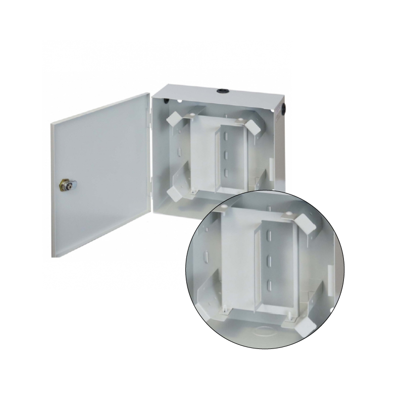 Oferowany produkt to przełącznica światłowodowa przystosowana do montażu naściennego. Została wykonana z blachy stalowej o grubości 1 mm i pomalowana w kolorze jasnoszarym RAL7035. Wymiary zewnętrzne wynoszą 255 x 255 x 101 mm.