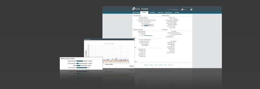 Wskaźniki jakości sygnału bezprzewodowego Siła sygnału / szum / CCQ transmisji / procesor / pamięć Monitory: przepustowość / stacje / ARP / trasy / WAN / DHCP Analiza spektrum Speed test Ping Traceroute |