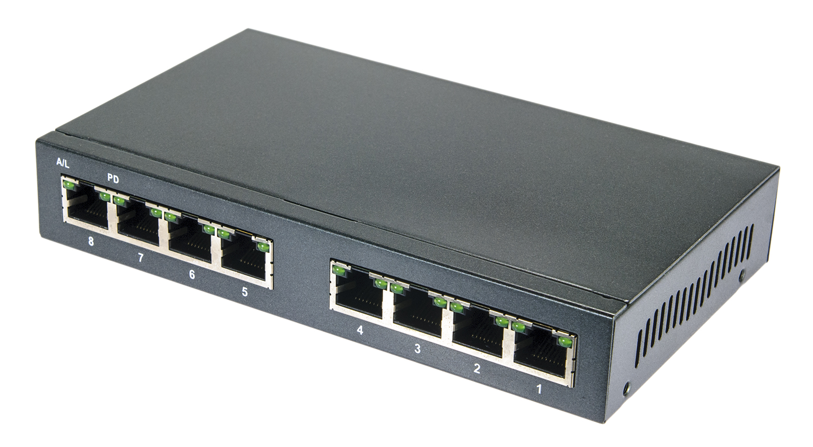 Switch PoE firmy Uplink wyposażony w 8 gigabitowych portów Ethernet. Pierwszy port przeznaczony jest na dane, natomiast pozostałe mogą zasilać inne urządzenia poprzez PoE. Napięcie wejściowe wynosi 12 - 60 V DC (power jack), napięcie wyjściowe również wynosi 12 - 60 V DC. Moc to maksymalnie 30 W na port, pary zasilające: 4, 5+; 7, 8-.