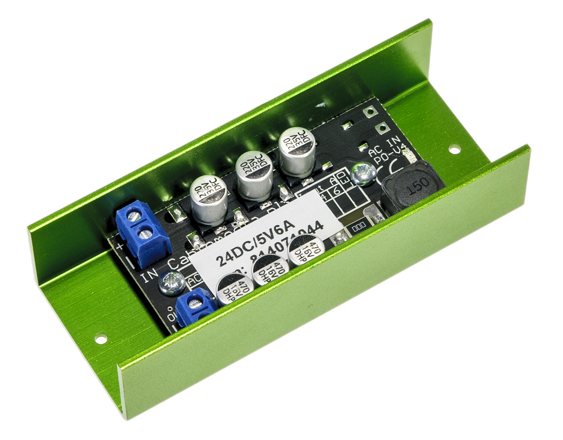 Przetwornica firmy Cablemedia - obniża napięcie z 24 na 5 V. Maksymalny prąd wyjściowy - 6 A. Oferowany produkt idealnie nadaje się do zasilania urządzeń 5 V ze standardowych zasilaczy 24 V (np. z zasilaczy buforowych). Przetwornica posiada otwartą obudowę, sugerujemy montowanie jej np. w puszkach instalacyjnych.