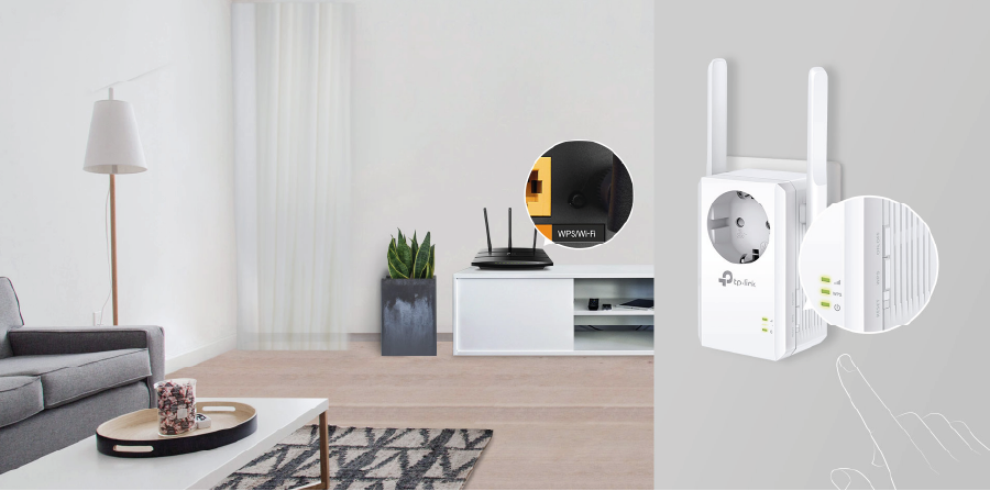 Aby połączyć się z siecią, wystarczy tylko nacisnąć przycisk WPS na routerze, a następnie na wzmacniaczu. To wszystko! Po uzyskaniu połączenia z routerem możesz przenieść swój wzmacniacz w dowolne miejsce znajdujące się w zasięgu sieci routera.