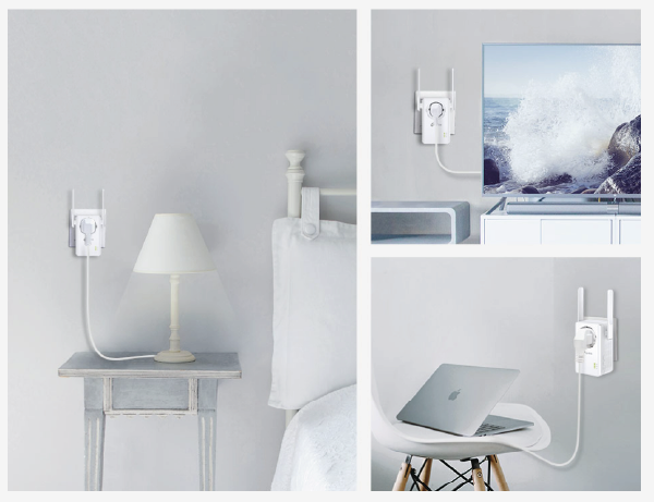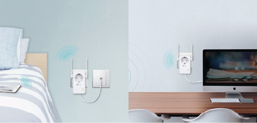 Wzmacniacz TL-WA860RE wyposażony jest we własne gniazdko, dlatego podłączając go do kontaktu nie blokujesz możliwości zasilania innych urządzeń. Liczba dostępnych gniazdek pozostaje taka sama!