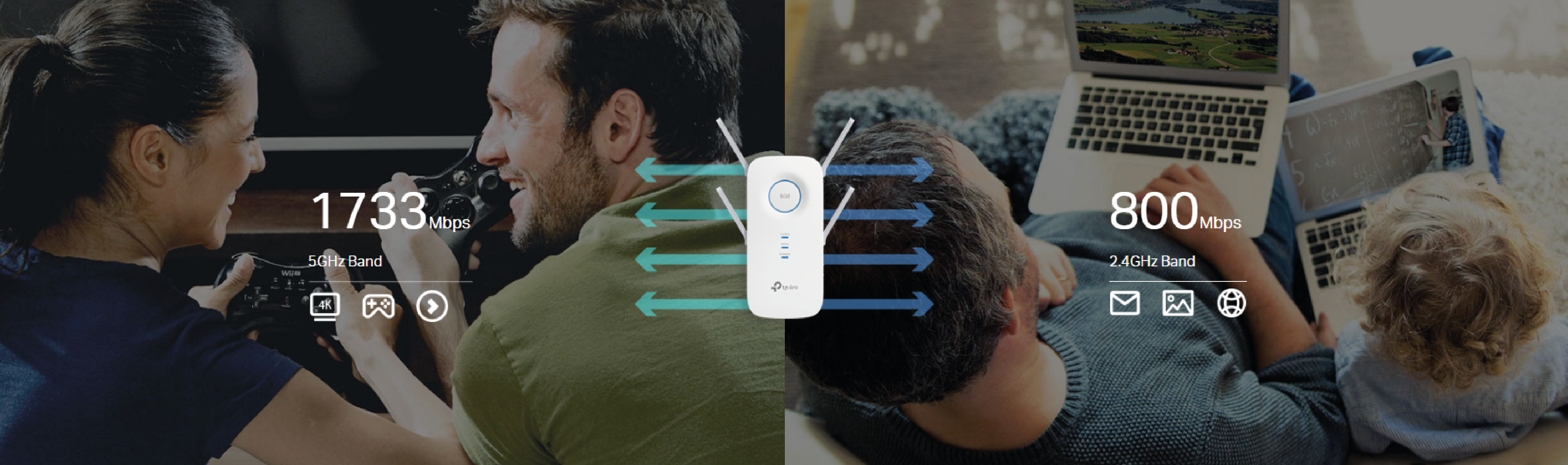 Korzystając z technologii 8-Strumieni, zwiększającej znacznie możliwości sieci Wi-Fi, RE650 osiąga wiodące w branży, najwyższe prędkości dochodzące do 800Mb/s w paśmie 2,4GHz oraz do 1733Mb/s w paśmie 5GHz. Zapewnia to niezwykłą szybkość i wydajność urządzenia, niezbędną do obsługi najbardziej wymagających działań sieciowych, w tym do przesyłu strumieniowego w jakości 4K oraz gier online, działających bez opóźnień.