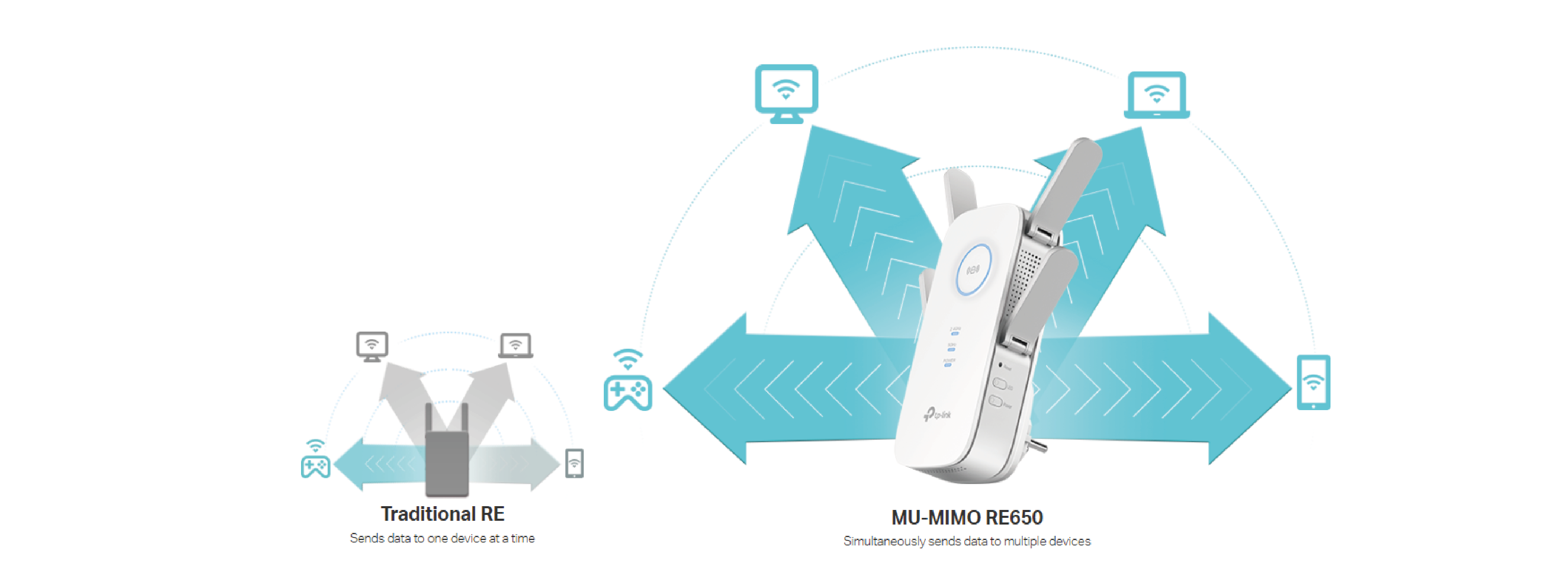 Technologia MU-MIMO pozwala urządzeniu RE650 obsługiwać maksymalnie 4 urządzenia jednoczenie,zmniejszając ich czas oczekiwania i znacznie zwiększając przepustowość Wi-Fi dla każdego urządzenia. Dzięki technologii MU-MIMO, RE650 działa do 4 razy szybciej niż tradycyjny wzmacniacz sieci w standardzie AC.