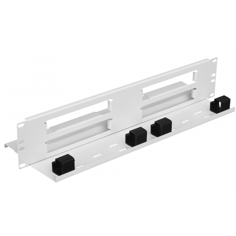 Oferowany produkt to przełącznica światłowodowa przystosowana do montażu w szafie Rack 19", wysokość wynosi 2U. Obudowa jest w stanie pomieścić 4 moduły (kasetki), w których łącznie można schować 48 spawy. Moduły pełnią funkcję tacki na 12 spawów oraz pozwalają ukryć zapas kabla. W kasetce bez problemu można zmieścić splitter PLC w obudowie typu steel box. Dodatkowo produkt wyposażony jest w półkę pełniącą funkcję organizera kabli (okablowanie można mocować przy pomocy opasek zaciskowych, możliwe jest również zamontowanie dodatkowych, plastikowych uchwytów).