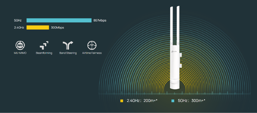 Wzmacniacz o dużej mocy i wydajna antena w połączeniu z technologią Wave 2 MU-MIMO 802.11ac nowej generacji, zapewniają bardzo duży zasięg sieci w obydwu pasmach, a także łączne prędkości dochodzące do 1167 Mb/s.