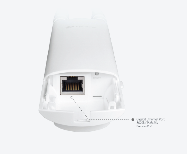 EAP225-Outdoor obsługuje zasilanie poprzez PoE 802.3af oraz Pasywne PoE. Można go zasilać wykorzystując przełącznik PoE lub dołączony zasilacz PoE.