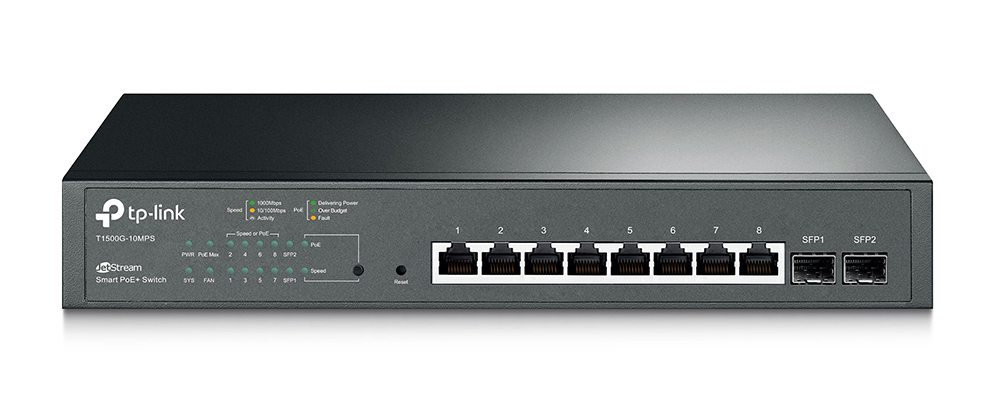 TP-Link T1500G-10MPS to zarządzalny switch Smart JetStream wyposażony w 8 gigabitowych portów Ethernet oraz 2 sloty SFP. Obudowa została przystosowana do montażu w szafie Rack 19", przepustowość przełączania wynosi 20 Gb/s, a prędkość przekazywania pakietów 14,9 Mp/s. Na każdym porcie Ethernet dostępne jest wyjście zasilania PoE, w standardzie IEEE 802.3 af/at. Maksymalna łączna moc zasilania wynosi 116 W.