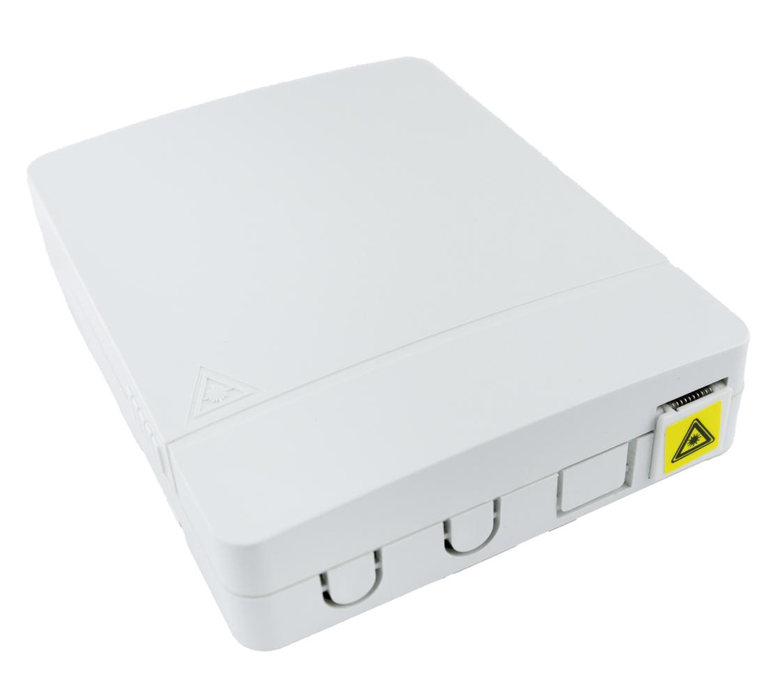 FTB-02D-SCA to domowa puszka zakończeniowa wyposażona w adapter i pigtail SC/APC (włókno G.652.D). Produkt montuje się naściennie, wewnątrz umieszczono tackę z miejscem na spawy i zapas kabla.