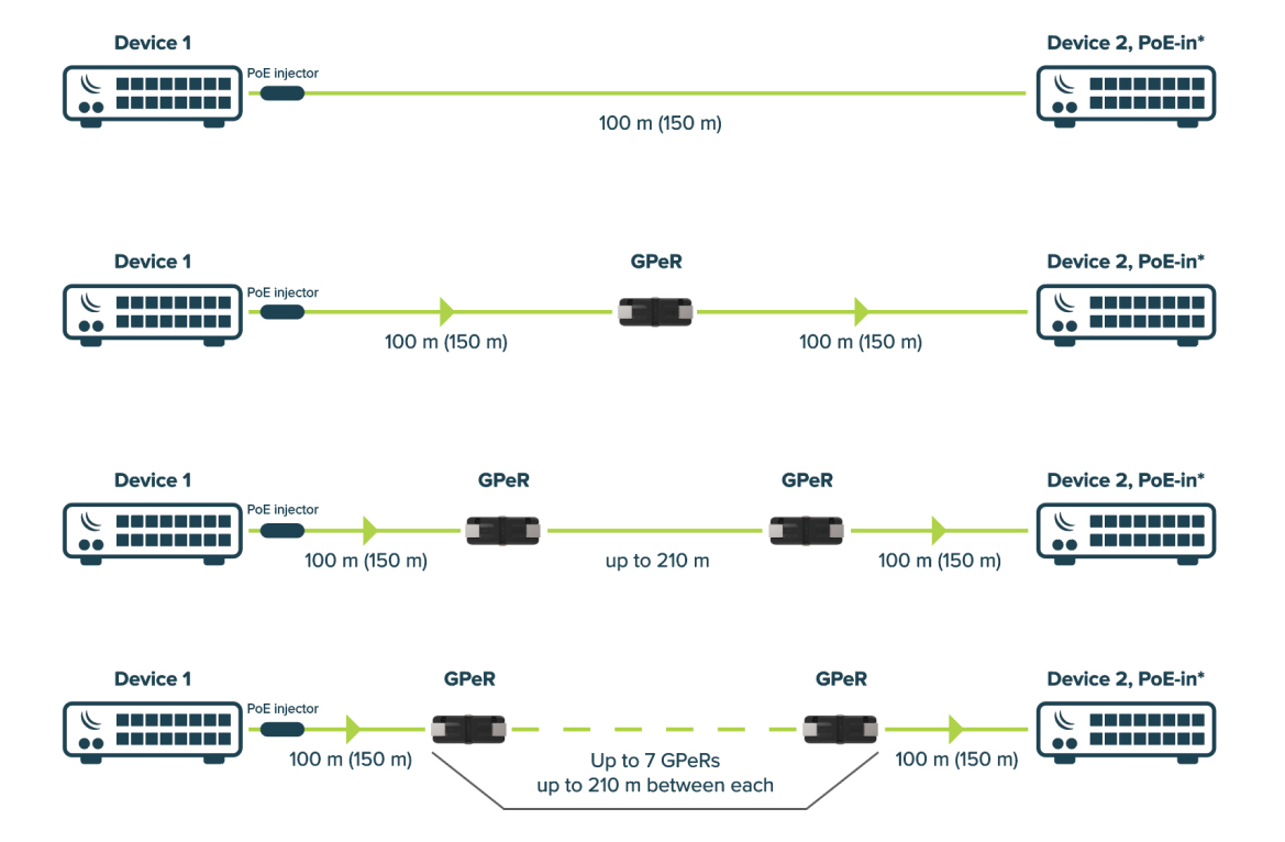 MikroTik GPeR to pasywny wzmacniacz Ethernet wyposażony w gigabitowe porty Ethernet. Umożliwia również rozszerzenie zasięgu zasilania PoE, ze stratą napięcia zasilania, w zależności od odległości. Jeden GPeR umożliwia wzmocnienie zasięgu o 100 - 150 metrów w przypadku połączenia ze zwykłym urządzeniem (switchem / routerem) lub nawet 210 metrów jeżeli po drugiej stronie znajduje się kolejny GPeR. Należy pamiętać, że zasięg rozszerzonej transmisji jest uzależniony od jakości kabla Ethernet.