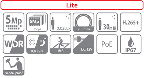 Kamera DH-IPC-HDBW1531E-0280B została wyposażona w przetwornik obrazu 1/2.7" 5MP Progressive Scan CMOS, który umożliwia zapis nagrań wideo z maksymalną rozdzielczością 5Mpx. Dostępne funkcje korekty, w tym WDR 120dB, 3DNR, zapewniają znakomitą jakoś otrzymywanego obrazu. Nowoczesny układ kompresji H.265+ sprawia, że przesyłany przez kamerę sygnał zajmuje mniej na miejsca na nośniku zapisu (np. dysku HDD), co przekłada się na skuteczną ochronę oraz dłuższy czas przechowywania danych. Dodatkowo stałoogniskowy obiektyw kamery 2.8mm umożliwia dokładne rejestrowanie obserwowanej sceny, a wbudowany oświetlacz podczerwieni o zasięgu 30m w technologii Smart IR gwarantuje prowadzenie całodobowego monitoringu z zachowaniem szczególności i czytelności uzyskiwanych nagrań. Urządzenie cechuje się dużym stopniem odporności na niekorzystne warunki atmosferyczne (IP67) oraz odporności mechanicznej na poziomie IK10.