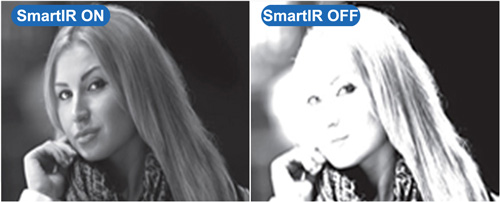 Funkcja Smart IR pozwala na zmianę podstawowych parametrów obrazu, takich jak ekspozycja, kontrast czy jasność. Procesor sygnałowy na bieżąco analizuje obraz i natychmiast po wykryciu prześwietlenia zmniejsza moc oświetlacza podczerwieni. Tym samym obraz staje się bardziej wyraźny, a prześwietlenia znikają.