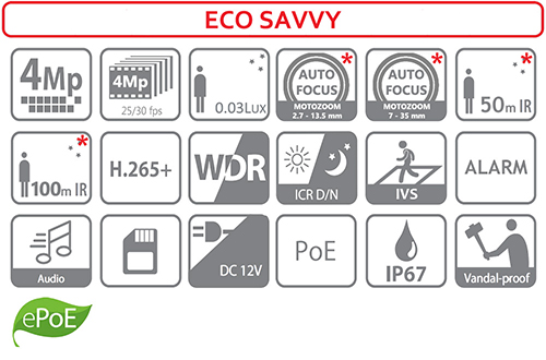 Technologia ePoE jedno z nowszych rozwiązań dostępnych w produktach Dahua Technology. Innowacyjna funkcjonalność pozwala na podłączenie oraz zasilanie kamery IP kablem sieciowym bądź kablem koncentrycznym. Technologia Dahua ePoE przyjmuje zaawansowaną modulację kodowania 2D-PAM3 z warstwy fizycznej i realizuje transmisję w pełnym dupleksie powyżej 800 metrów z prędkością 10 Mb / s lub 300 metrów z szybkością 100 Mb / s za pośrednictwem skrętki komputerowej Cat.5 lub przewodu koncentrycznego. Dahua ePoE otwiera nowy sposób osiągania transmisji na duże odległości między kamerami IP i przełącznikami sieciowymi. Zapewnia także bardziej elastyczną konstrukcję systemu nadzoru, poprawia niezawodność i oszczędza koszty budowy i okablowania.