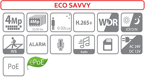 Kamera DH-IPC-HF5431E-E została wyposażona w nowoczesny przetwornik obrazu 1/3" 4MP Progressive Scan CMOS, który umożliwia zapis nagrań wideo z maksymalną rozdzielczością 4Mpx. Liczne dostępne funkcje korekty, w tym WDR, 3DNR, zapewniają znakomitą jakoś otrzymywanego obrazu. Nowoczesny układ kompresji H.265+ sprawia, że przesyłany przez kamerę sygnał zajmuje mniej na miejsca na nośniku zapisu (np. dysku HDD lub karcie microSD), co przekłada się na skuteczną ochronę oraz dłuższy czas przechowywania danych. Możliwość montażu obiektywu z gniazdem C/CS wyposażonego w Auto Iris pozwala na dokładne rejestrowanie obserwowanej sceny, a wbudowany mechaniczny filtr ICR gwarantuje prowadzenie całodobowego monitoringu z zachowaniem szczególności i czytelności uzyskiwanych nagrań. Dodatkowo inteligentne systemy analizy obrazu zwiększają poziom bezpieczeństwa i gwarantują wykrycie wszystkich niepożądanych zachowań. Atutem urządzenia jest również wbudowany slot na karty microSD (128 GB), mikrofon oraz wejścia / wyjścia alarmowe. Kamera megapikselowa HF5431EE może być zasilana na kilka sposobów: napięciem stałym 12V lub zmiennym 24V oraz poprzez kabel sieciowy (PoE). Urządzenie wspiera również technologię ePoE, dzięki której zapewnia skuteczne połączenie nawet do 800m w pełnym dupleksie.