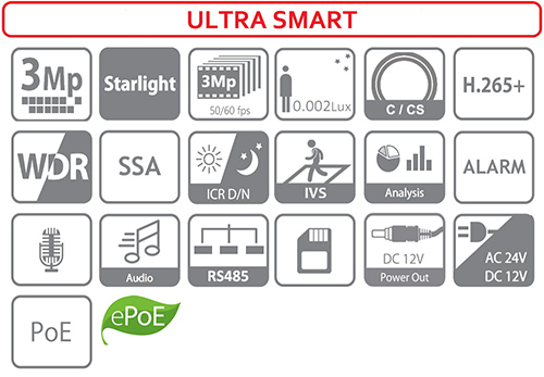 Kamera DH-IPC-HF8331F-E została wyposażona w wysokiej klasy przetwornik obrazu 1/2.8" 3MP Starvis Progressive Scan CMOS, który umożliwia zapis nagrań wideo z maksymalną z rozdzielczością 3Mpx. Czułość w technologii Starlight oraz liczne dostępne funkcje korekty, w tym WDR 140dB, SSA, 3DNR, zapewniają znakomitą jakoś obrazu. Nowoczesny układ kompresji H.265+ sprawia, że przesyłany przez kamerę sygnał zajmuje mniej na miejsca na nośniku zapisu (np. dysku HDD lub karcie microSD), co przekłada się na skuteczną ochronę oraz dłuższy czas przechowywania danych. Możliwość montażu obiektywu z gniazdem C/CS wyposażonego w Auto Iris pozwala na dokładne rejestrowanie obserwowanej sceny, a wbudowany mechaniczny filtr ICR gwarantuje prowadzenie całodobowego monitoringu z zachowaniem szczególności i czytelności uzyskiwanych nagrań. Dodatkowo inteligentne systemy analizy obrazu oraz funkcje inteligentnej analizy biznesowej zwiększają poziom bezpieczeństwa i gwarantują wykrycie wszystkich niepożądanych zachowań. Atutem urządzenia jest również wbudowany slot na karty microSD (128 GB), mikrofon oraz wejścia / wyjścia alarmowe. Kamera megapikselowa HF8331F-E może być zasilana na kilka sposobów: napięciem stałym 12V lub zmiennym 24V oraz poprzez kabel sieciowy (PoE). Dzięki wszystkim cechom montaż oraz obsługa urządzenia przebiega w sposób niezakłócony, sprawny i komfortowy. Urządzenie wspiera także technologię ePoE, dzięki której zapewnia skuteczne połączenie nawet do 800m w pełnym dupleksie.