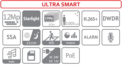 Kamera DH-IPC-HF81230E została wyposażona w wysokiej klasy przetwornik obrazu 1/1.7" 12MP Starvis Progressive Scan CMOS, który umożliwia zapis nagrań wideo z wysoką rozdzielczością 12Mpx. Czułość w technologii Starlight oraz liczne dostępne funkcje korekty, w tym DWDR, SSA, 3DNR, zapewniają znakomitą jakoś obrazu. Nowoczesny układ kompresji H.265+ sprawia, że przesyłany przez kamerę sygnał zajmuje mniej na miejsca na nośniku zapisu (np. dysku HDD lub karcie microSD), co przekłada się na skuteczną ochronę oraz dłuższy czas przechowywania danych. Możliwość montażu obiektywu z gniazdem C/CS wyposażonego w Auto Iris pozwala na dokładne rejestrowanie obserwowanej sceny, a wbudowany mechaniczny filtr ICR gwarantuje prowadzenie całodobowego monitoringu z zachowaniem szczególności i czytelności uzyskiwanych nagrań. Dodatkowo inteligentne systemy analizy obrazu oraz funkcje inteligentnej analizy biznesowej zwiększają poziom bezpieczeństwa i gwarantują wykrycie wszystkich niepożądanych zachowań. Atutem urządzenia jest również wbudowany slot na karty microSD (128 GB), mikrofon oraz wejścia / wyjścia alarmowe. Kamera megapikselowa HF81230E może być zasilana na kilka sposoby: napięciem stałym 12V lub zmiennym 24V oraz poprzez kabel sieciowy (PoE). Dzięki wszystkim cechom montaż oraz obsługa urządzenia przebiega w sposób niezakłócony, sprawny i komfortowy.