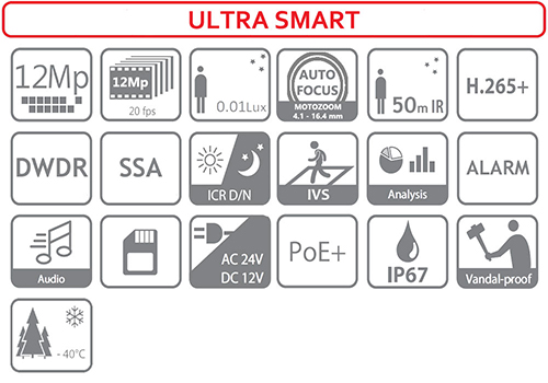 Kamera DH-IPC-HDBW81230EP-ZH została wyposażona w wysokiej klasy przetwornik obrazu 1/1.7" 12MP Starvis Progressive Scan CMOS, który umożliwia zapis nagrań wideo z maksymalną rozdzielczością 12Mpx. Liczne dostępne funkcje korekty, w tym dostępne funkcje korekty, w tym DWDR, SSA, 3DNR, zapewniają znakomitą jakoś otrzymywanego obrazu. Nowoczesny układ kompresji H.265+ sprawia, że przesyłany przez kamerę sygnał zajmuje mniej na miejsca na nośniku zapisu (np. dysku HDD lub karcie microSD), co przekłada się na skuteczną ochronę oraz dłuższy czas przechowywania danych. Dodatkowo obiektyw typu motozoom, który przy pomocy wbudowanego silniczka elektrycznego umożliwia zewnętrzną, zdalną regulacje poziomu ogniskowej, a także sam, automatycznie dostosowuje poziom ostrości. Oświetlacz podczerwieni o zasięgu 50m w technologii Smart IR gwarantuje prowadzenie całodobowego monitoringu z zachowaniem szczególności i czytelności uzyskiwanych nagrań. Funkcje: inteligentne systemy analizy obrazu oraz inteligentna analiza biznesowa zwiększają poziom bezpieczeństwa i gwarantują wykrycie wszystkich niepożądanych zachowań. Atutem urządzenia jest również wbudowany slot na karty microSD (128 GB), wejścia / wyjścia alarmowe oraz grzałka. Urządzenie cechuje się dużym stopniem odporności na niekorzystne warunki atmosferyczne (IP67) oraz odporności mechanicznej na poziomie IK10.