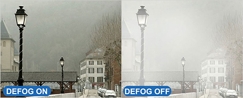 System przeciwmgielny ma za zadaniem realizować w czasie rzeczywistym potrzeby reaktywnej korekcji obrazu w sytuacji występowania niekorzystnych zjawisk atmosferycznych takich jak mgła, deszcz czy smog. Kamera z funkcją Defog samoczynnie steruje parametrami obrazu umożliwiając zachowanie skuteczności pracy w ramach dynamicznie zmieniających się warunków środowiska zewnętrznego.