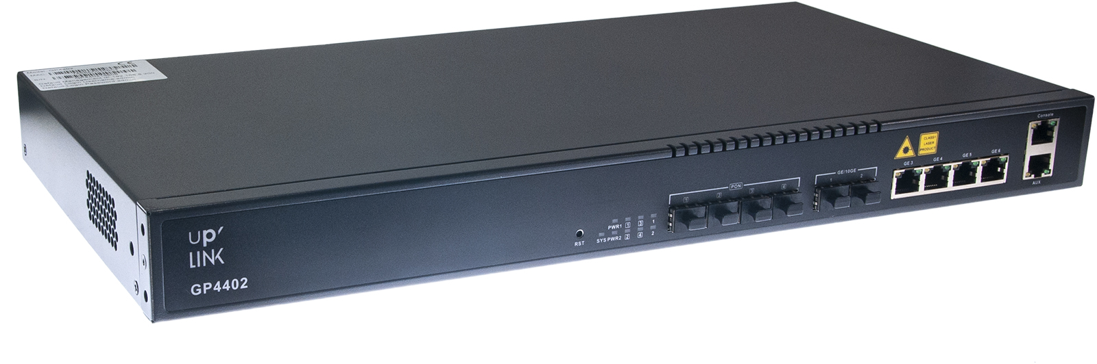 Uplink GP4402 to terminal OLT przystosowany do wykorzystania w sieci GPON. Wyposażony jest w 4 porty PON oraz 6 portów uplinkowych, w tym 4 gigabitowe porty Ethernet i 2 sloty SFP+ (10 Gb/s). Dodatkowo urządzenie posiada porty Console i Aux (Ethernet). OLT w pełni wspiera multicasty i IGMP Snooping, doskonale nadaje się do dostarczania usług typu triple play.