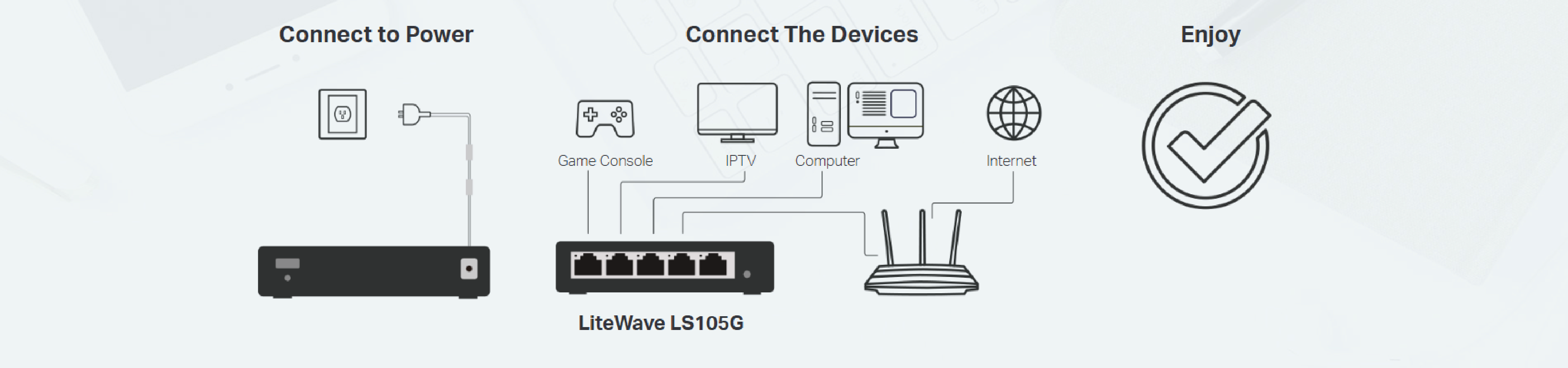Niezarządzalne przełączniki z serii LiteWave TP-Link to łatwy i korzystny cenowo sposób rozbudowy sieci przewodowej. Urządzenia nie sprawiają trudności w użytkowaniu i są niezawodne. Dzięki instalacji typu plug and play, podłączanie nowych urządzeń trwa zaledwie kilka minut. Wszystkie porty obsługują Auto-MDI/MDIX, dlatego nie trzeba tracić czasu na wybór odpowiedniego kabla.